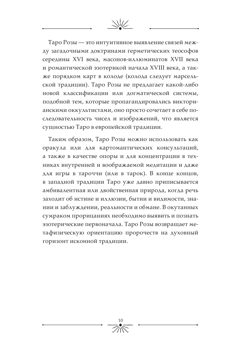 «Таро розы» Найджела Джексона — колода, созданная под влиянием образов и символов алхимии, средневекового герметизма и символизма. Она сочетает в себе элементы и традицию Таро Уэйта со средневековым очарованием Марсельского Таро. Работая с ней, вы исследуете куртуазные тайны рыцарства и любви, секреты каббалы и алхимии, а также духовную функцию символов Таро, которые являются вратами в пространство между материальной и духовной сферами. Это Таро с мощной энергетикой подойдет для предсказаний и духовных практик.
