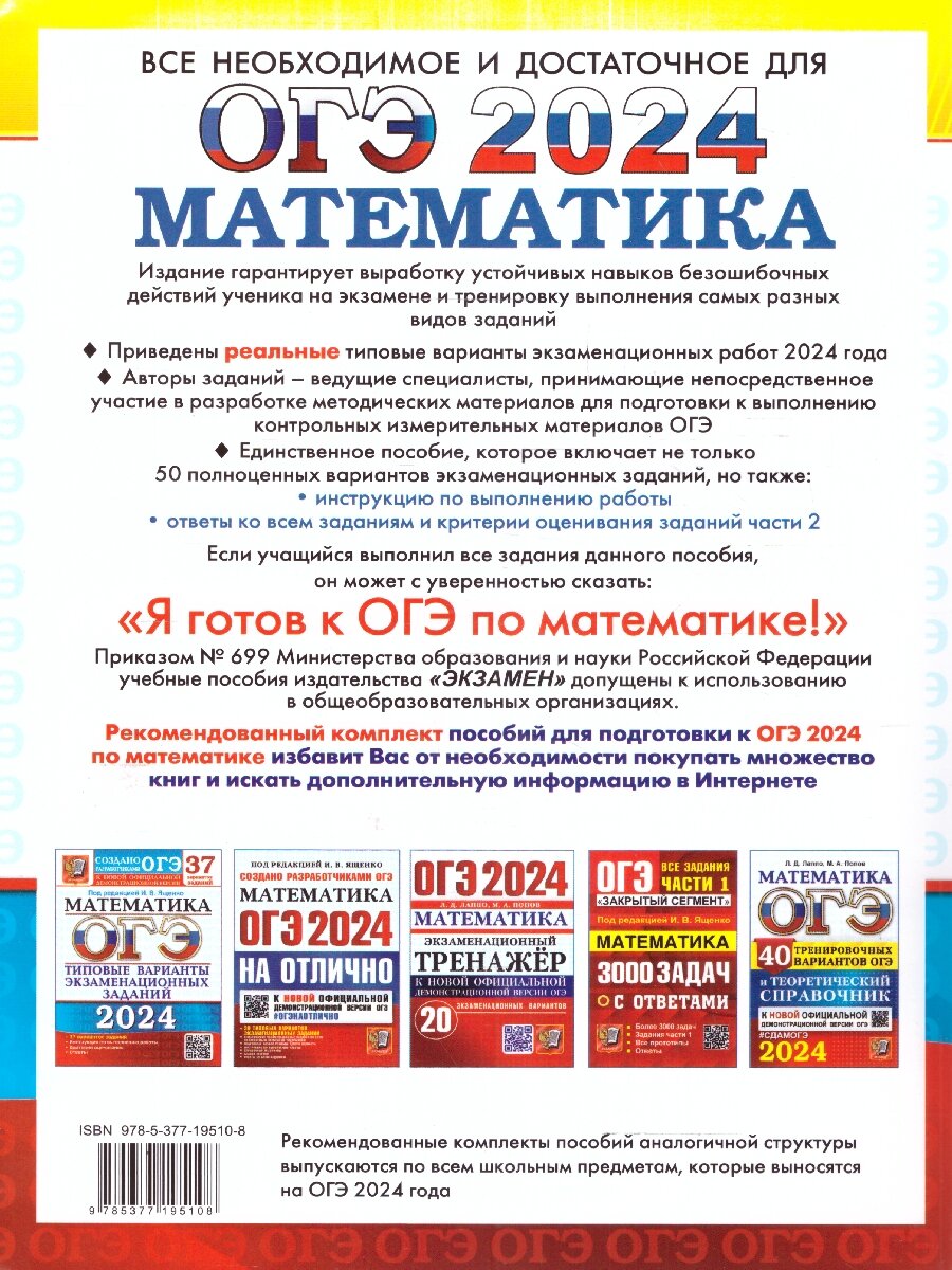 Авторы заданий — ведущие специалисты, принимающие непосредственное участие в разработке методических материалов для подготовки к выполнению контрольных измерительных материалов ОГЭ.Пособие содержит 50 типовых вариантов экзаменационных заданий Основного государственного экзамена 2024 года по математике.Назначение пособия — отработка практических навыков учащихся по подготовке к экзамену по математике в 9 классе.В сборнике даны ответы ко всем заданиям.Пособие адресовано учителям и методистам, использующим типовые варианты экзаменационных заданий для подготовки учащихся к Основному государственному экзамену 2024 года, оно также может быть использовано учащимися для самоподготовки и самоконтроля.