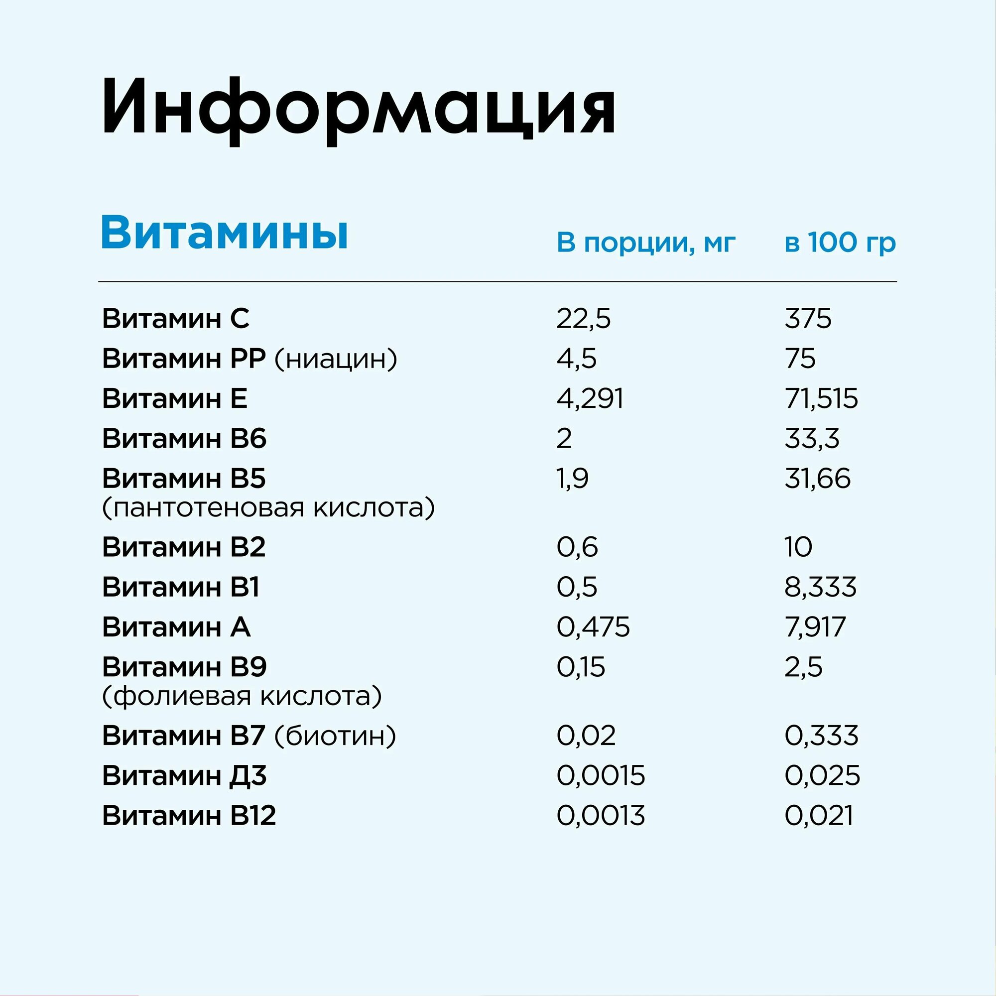 | Состав | гидролизат Коллагена 5г, Гиалуроновая кислота 0,1грегулятор кислотности (лимонная кислота), ароматизатор натуральный («Малина»), антиокислитель (аскорбиновая кислота), краситель натуральный (свекла порошок), подсластитель (сукралоза), аскорбиновая кислота (витамин С), никотинамид (витамин РР), DL–альфа-токоферола ацетат (витамин Е), пиридоксин гидрохлорид (витамин В6), D-пантотенат кальция (витамин В5), рибофлавин (витамин В2), тиамина гидрохлорид (витамин В1), ретинола ацетат (витамин А), фолиевая кислота (витамин В9), биотин (витамин В7), холекальциферол (витамин Д3), цианокобаламин (витамин В12). |