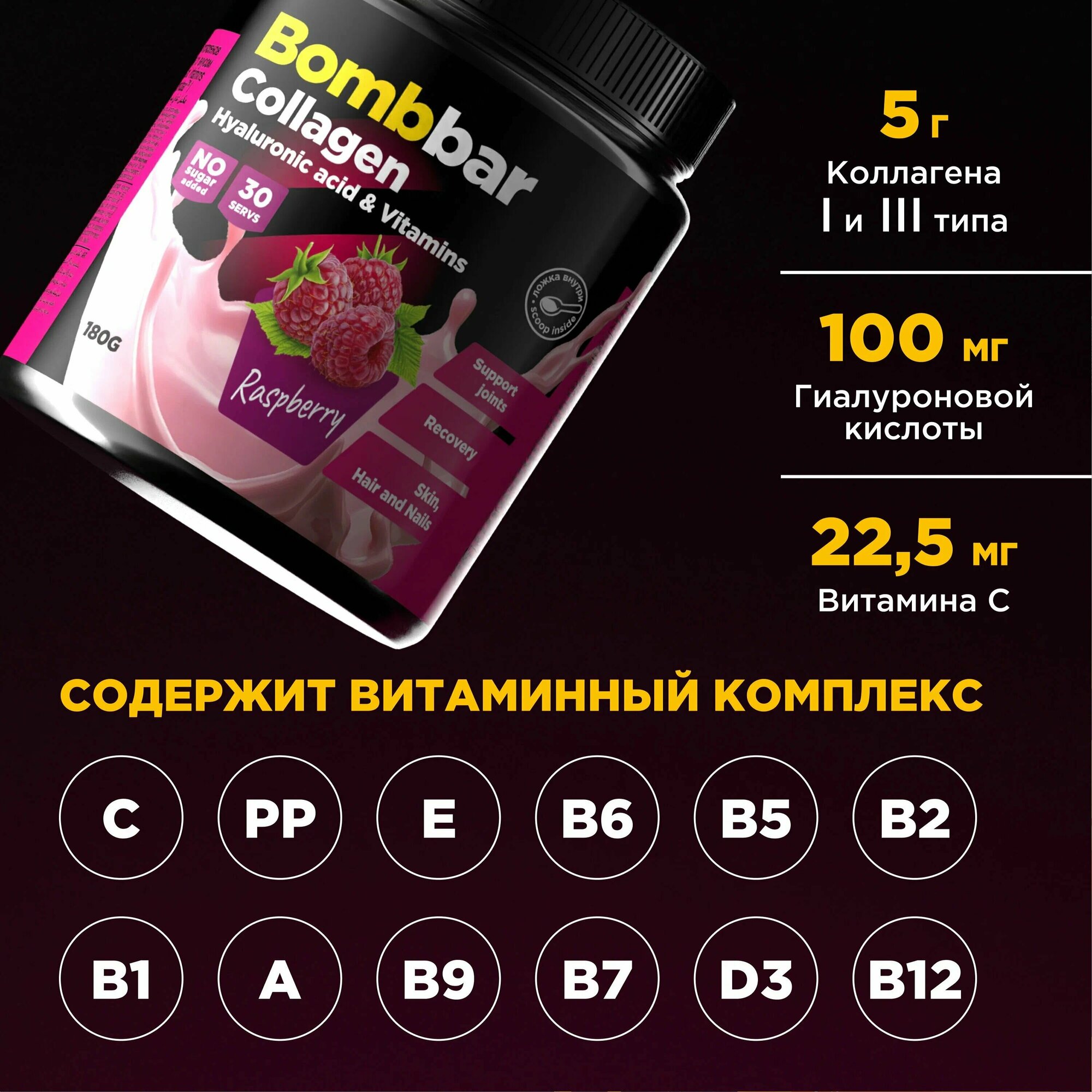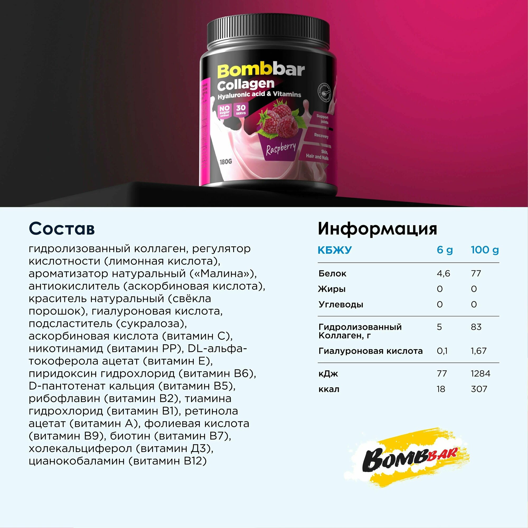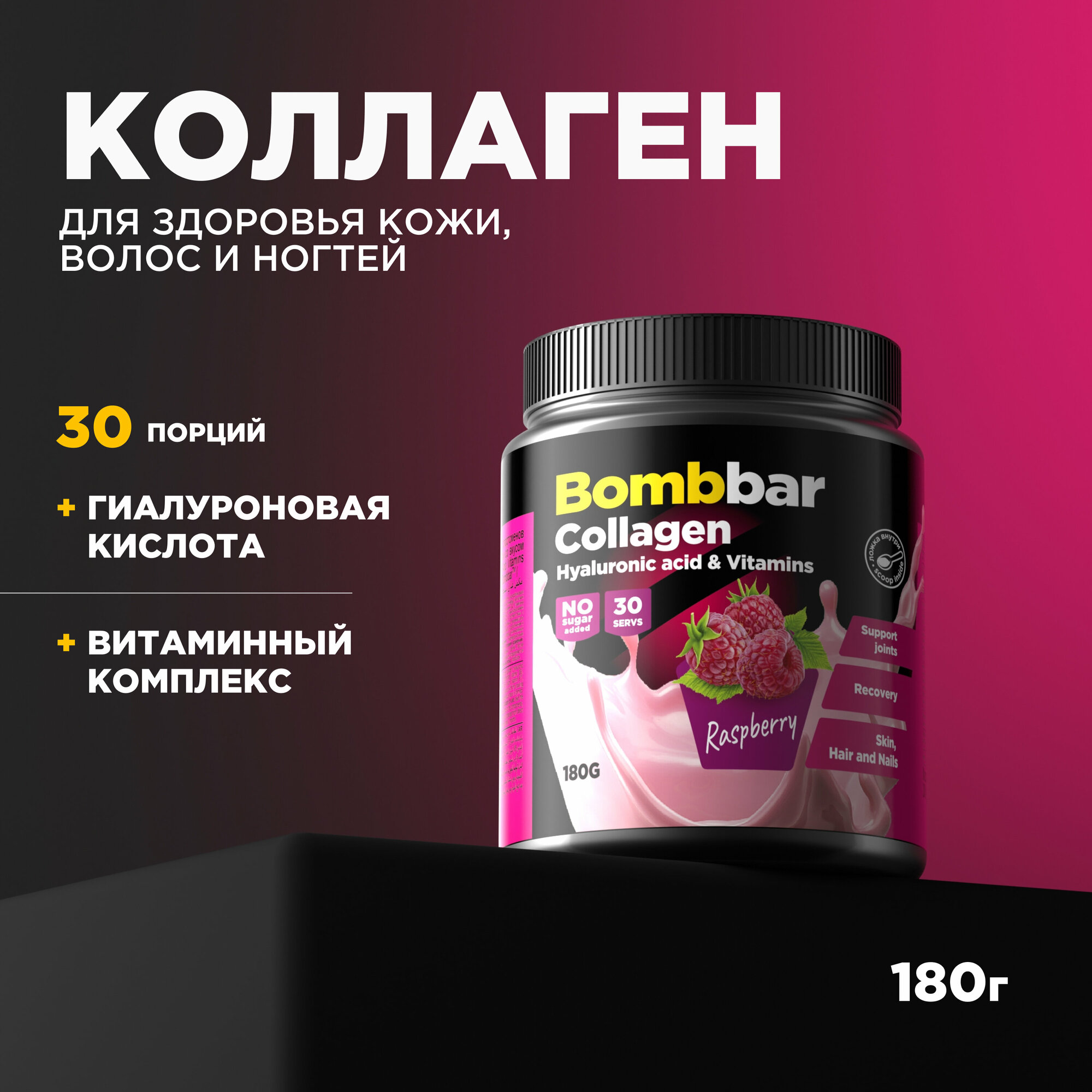 Коктейль коллаген с гиалуроновой кислотой и витаминами малина Bombbar 180г ООО Фитнес Фуд (2664470)