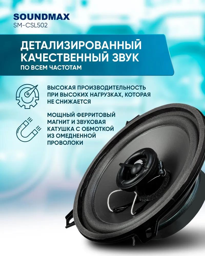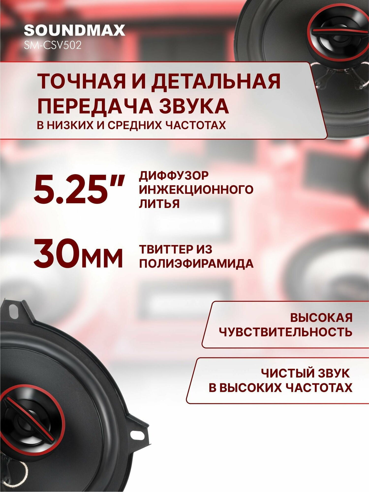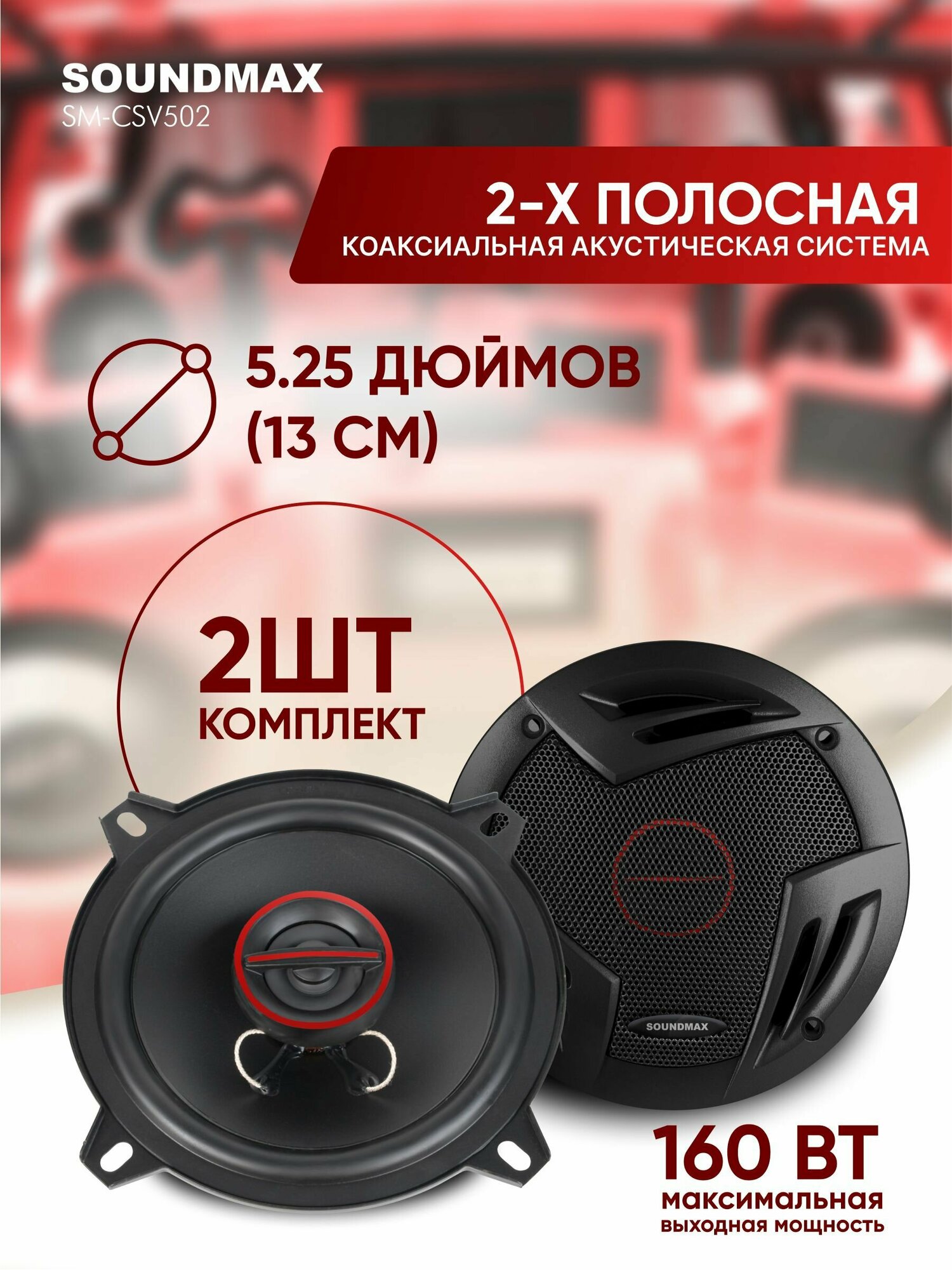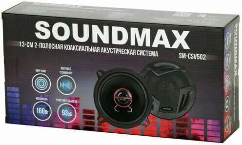 Автомобильные колонки Soundmax , максимальная мощность 160 Вт, размер динамика 13 см (5 дюйм.), коаксиальные, двухполосные, чувствительность 93дБ, импеданс 4Ом