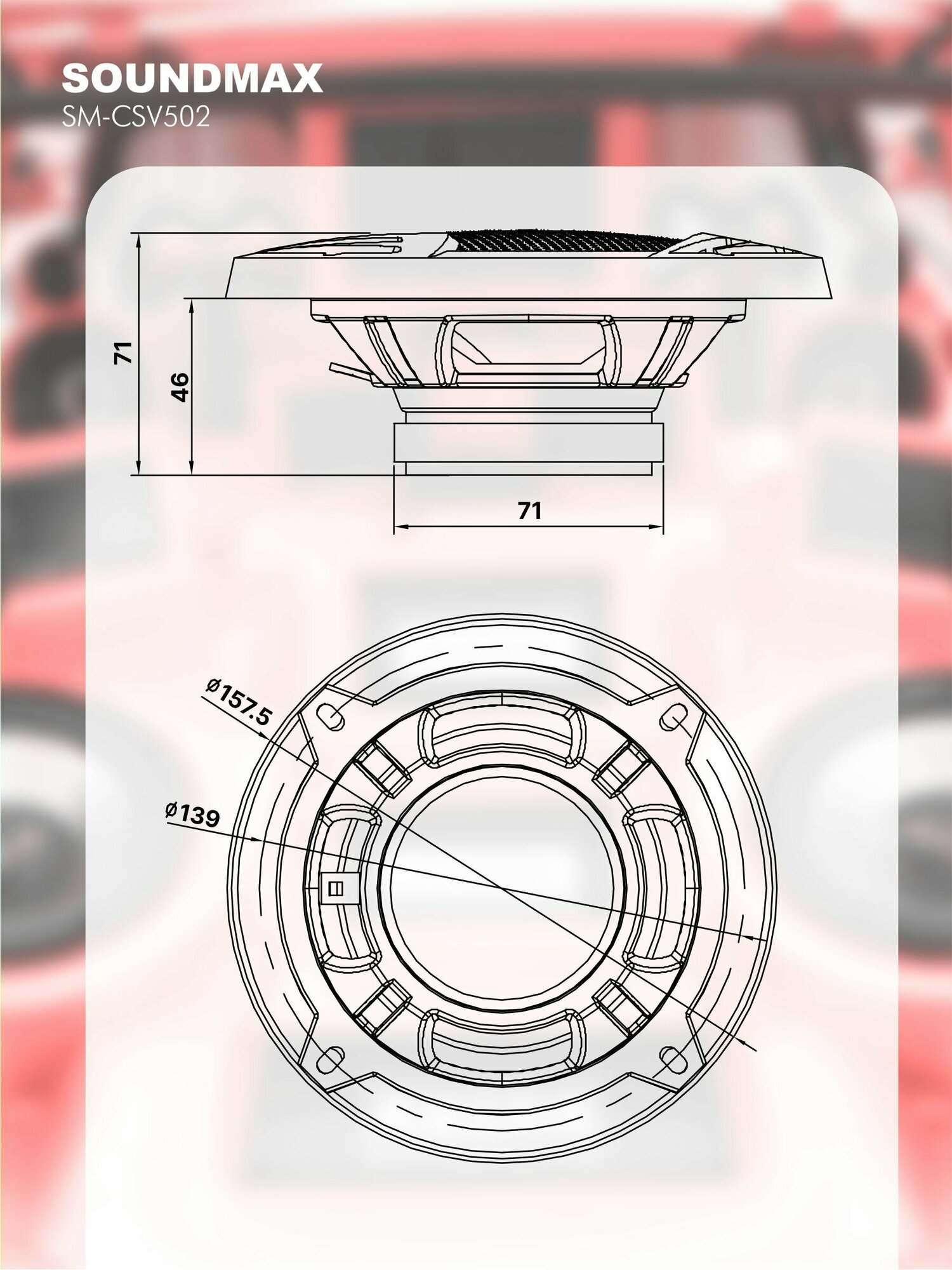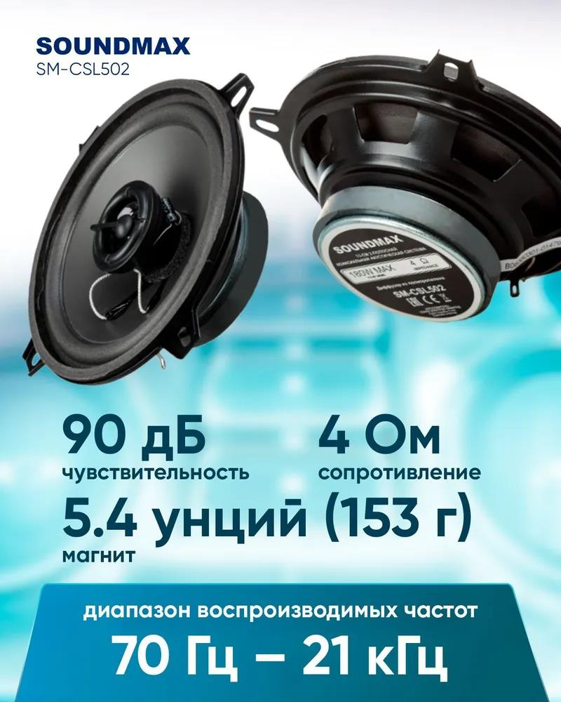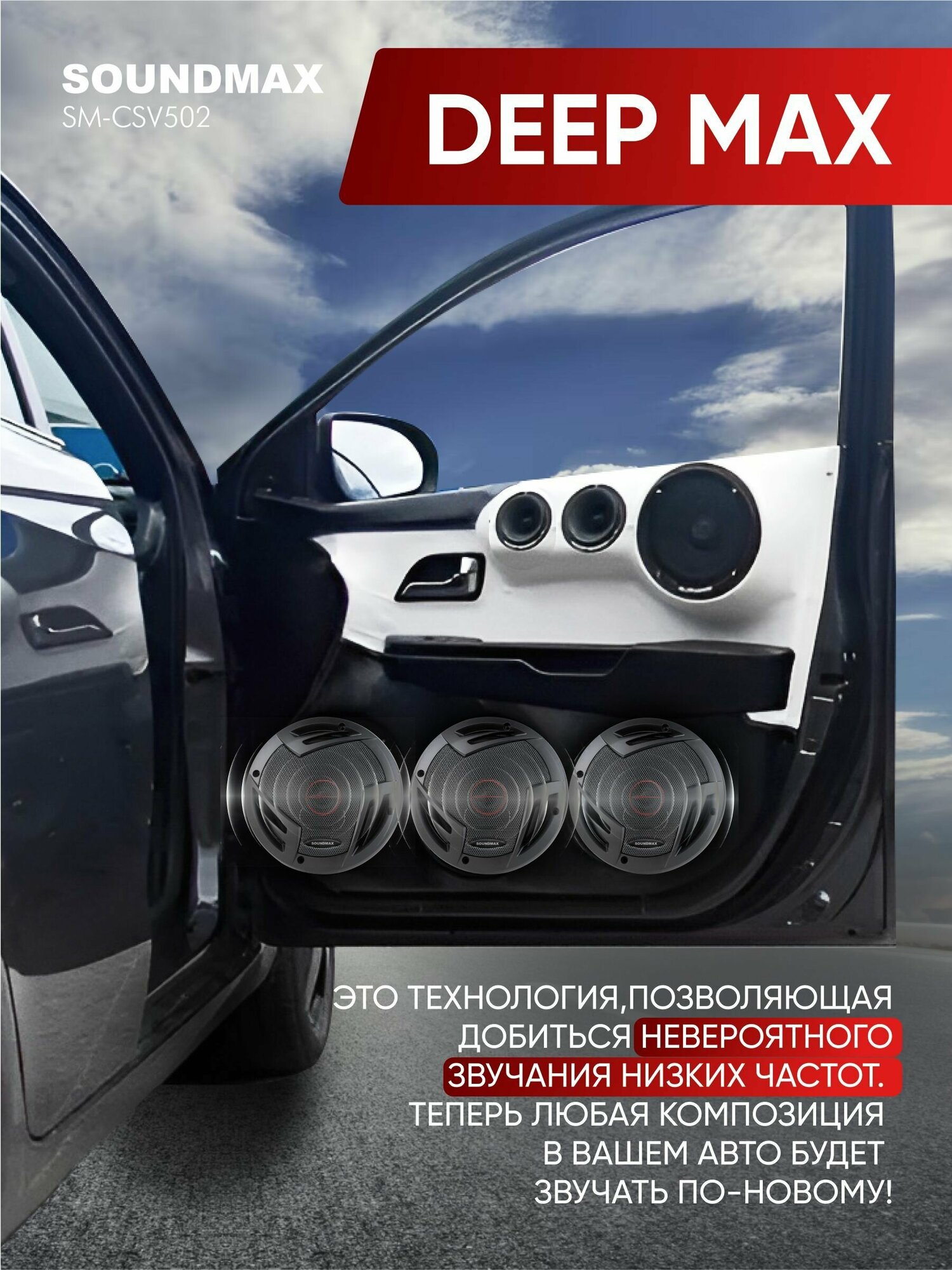 Автомобильные колонки Soundmax , максимальная мощность 160 Вт, размер динамика 13 см (5 дюйм.), коаксиальные, двухполосные, чувствительность 93дБ, импеданс 4Ом
