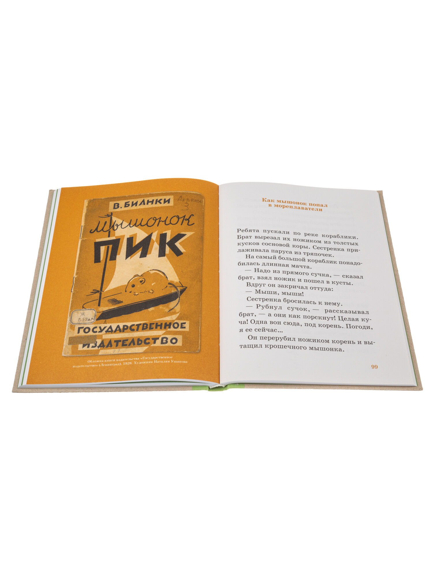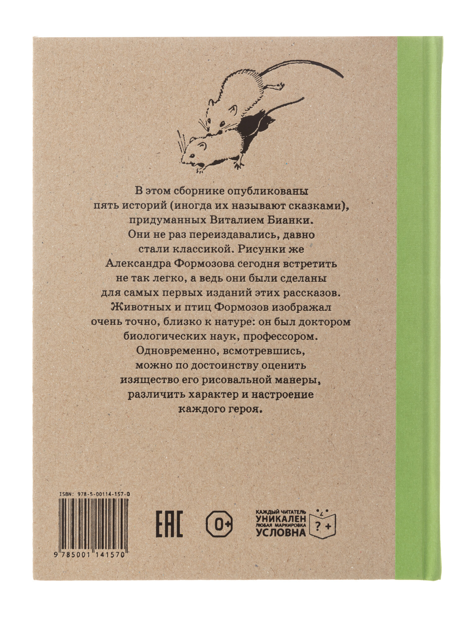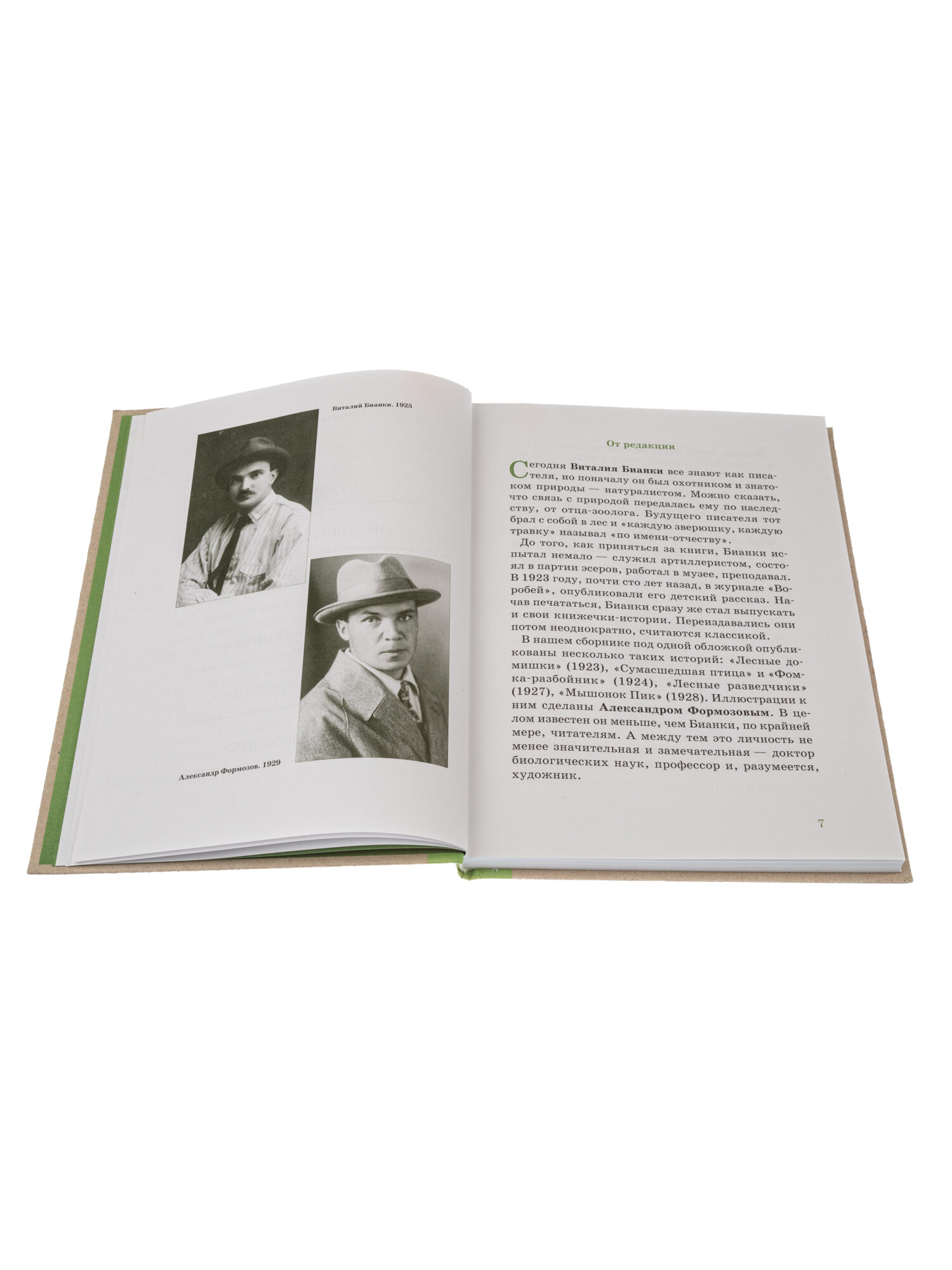 В этой книге под одной обложкой собраны пять таких историй: «Лесные домишки» (1923), «Сумасшедшая птица» и «Фомка-разбойник» (1924), «Лесные разведчики» (1927), «Мышонок Пик» (1928). Эти рассказы, которые иногда называют сказками, не раз переиздавались, они хорошо известны читателю. Рисунки же Александра Формозова сегодня встретить не так легко, а ведь они были сделаны для самых первых изданий этих рассказов — еще в 1920-е—1930-е годы.
