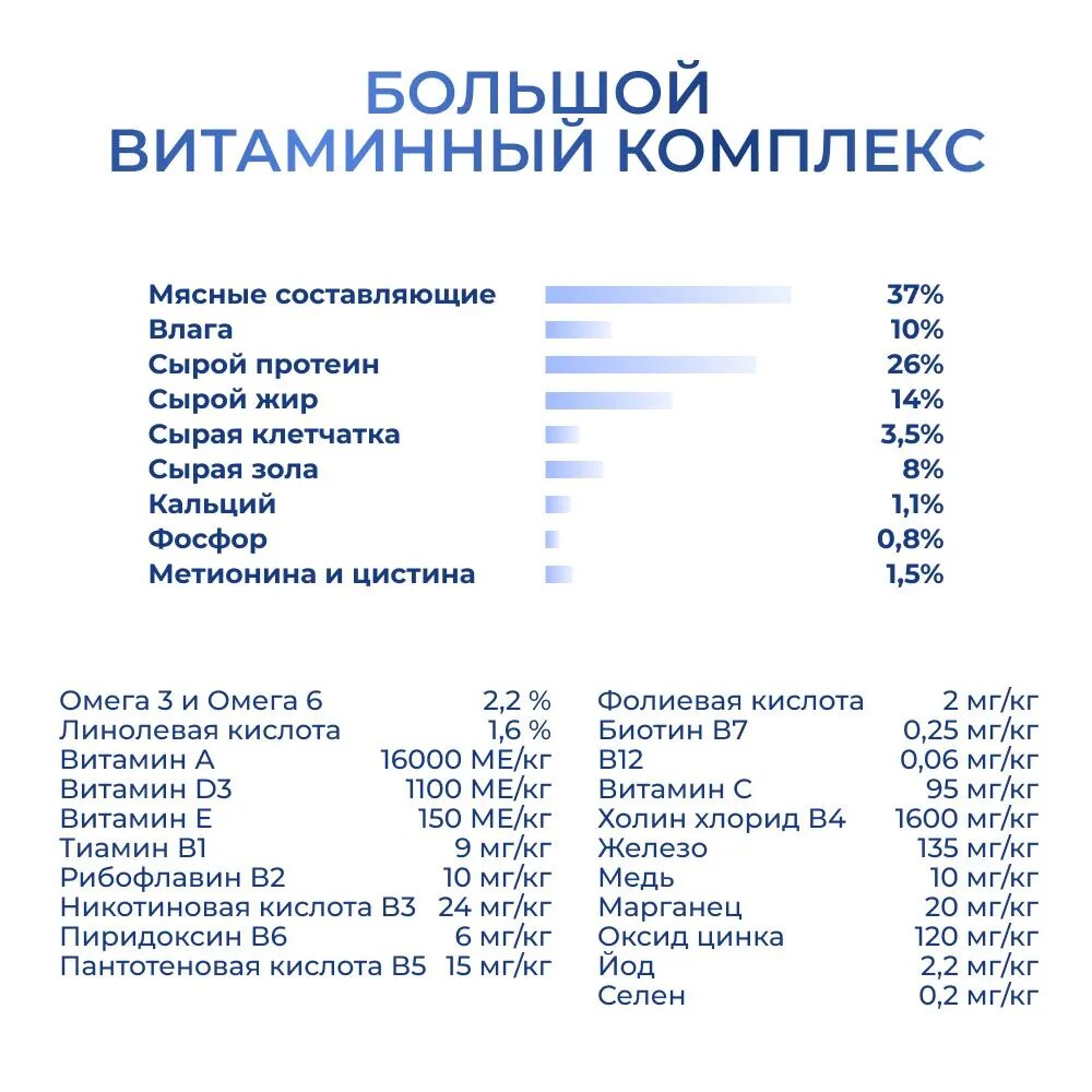 дегидрированное мясо (курицы 23 % и говядины 9 %), кукуруза, животный жир, в т.ч. куриный, клетчатка, рис, пшеничная мука, ячменная мука, гидролизованные животные белки, витаминно-минеральный комплекс, рыбий жир, морковь, яблоко, экстракт Юкки Шидигера, пробиотический комплекс (Bacillus subtilis, Bacillus licheniformis), пребиотики (MOC, корень цикория), люцерна. Сохранено антиоксидантами, консервантами, экстрактом розмарина и витамином Е. Пищевая ценность: влага – max 10 %, сырой протеин – min 26 %, сырой жир – min 17 %, сырая клетчатка – max 3 %, сырая зола – max 8 %, кальций – min 1,5 %, фосфор – min 1 %, лизин – min 1,5 %, триптофан – min 0,2 %, метионина и цистина – min 0,7 %, натрий – min 0,06 %, хлориды – max 0,09 %.