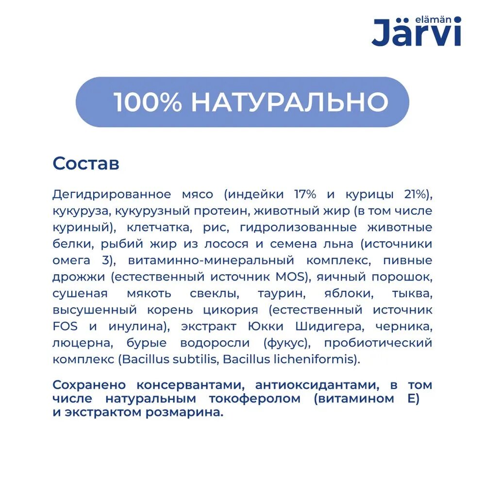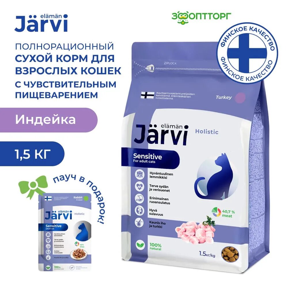 Сухой полнорационный корм Jarvi для взрослых кошек с чувствительным пищеварением с индейкой, 1,5 кг.Корм Jarvi для кошек с чувствительным пищеварением изготовлен из натуральных ингредиентов высокого качества, включая дегидрированное мясо индейки и курицы, кукурузу, животный жир, клетчатку, рыбий жир, витаминно-минеральный комплекс и пробиотический комплекс.Сухой корм Jarvi обеспечивает вашего питомца всеми необходимыми витаминами, минералами и питательными веществами для поддержания здоровья и активности. В составе корма содержится 19% дегидрированного мяса индейки и 21% курицы, а также натуральные источники омега 3, 6 и 9, витамины и минералы.Поддержание здоровья: корм способствует поддержанию здоровья пищеварительной системы, иммунитета и общего благополучия вашего питомца.Удобная упаковка с Zip-lock замком обеспечивает герметичное закрытие после каждого использования, сохраняя свежесть корма и предотвращая его окисление и потерю питательных свойств.Корм Jarvi – это забота о вашей кошке, которая не упускает из виду вкусовые предпочтения вашего питомца.