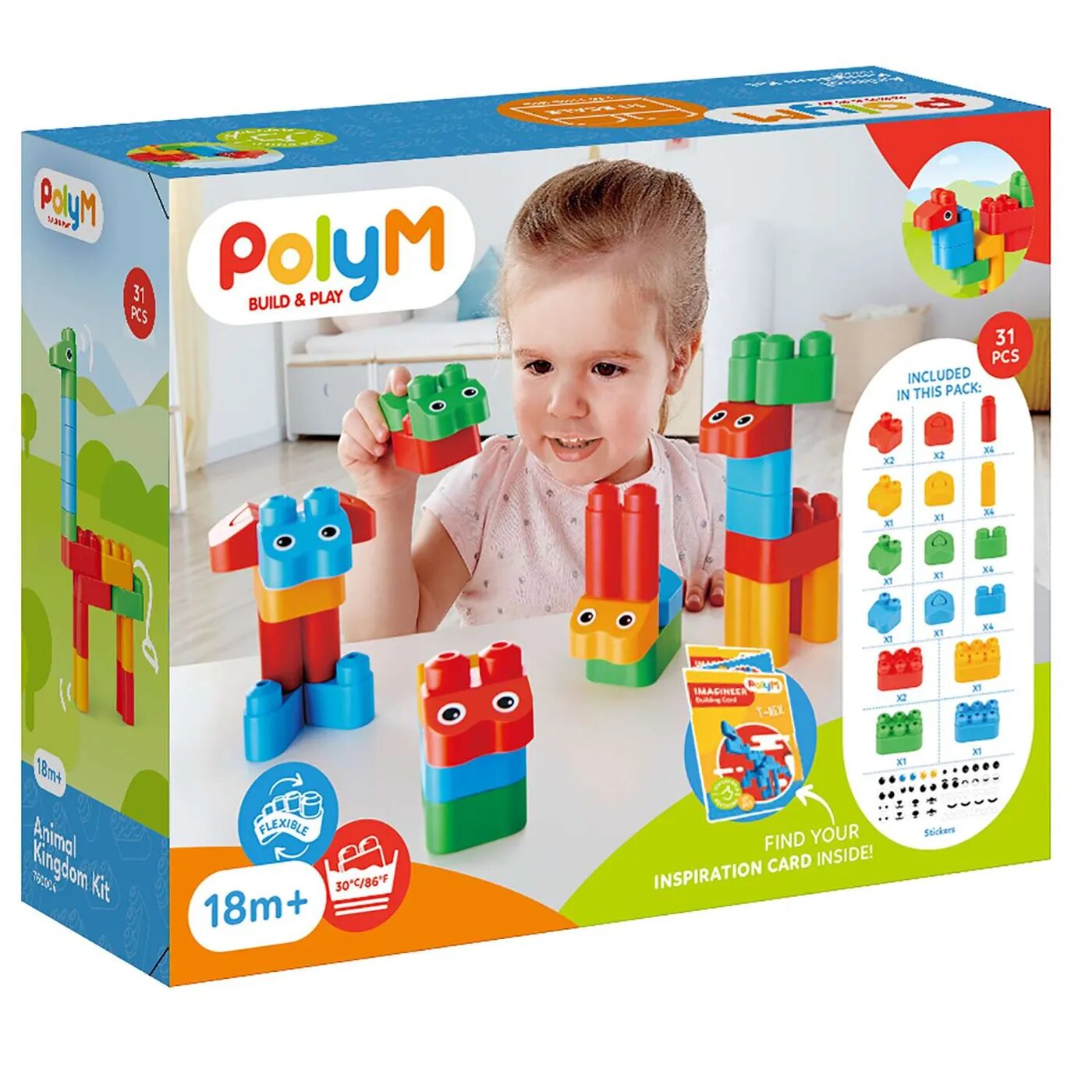 Набор Царство животных включает в себя 31 кубик PolyM, две наклейки для глаз, инструкции по сборке и брошюру.