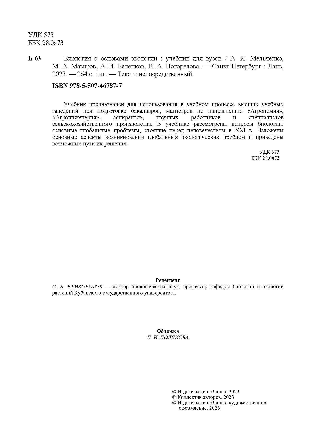 Биология с основами экологии (Беленков Алексей Иванович, Мазиров Михаил Арнольдович, Мельченко Александр Иванович); Лань, 2023