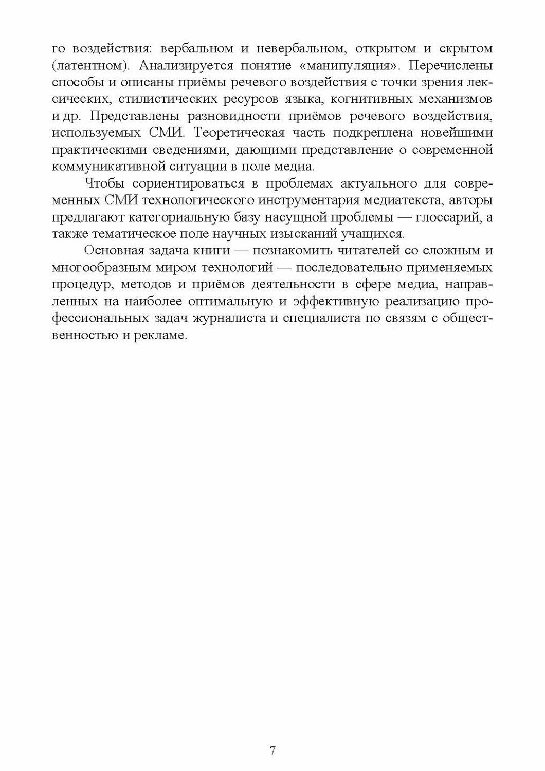 В учебном пособии представлен материал по технологиям современного медиатекста печатных и электронных СМИ. Первая часть пособия посвящена проблеме журналистского творчества в массмедиа. Рассмотрен вопрос антропологии текста, суть и природа медийного факта, методы сбора и интерпретации фактической информации, принципы и роль журналистского расследования. Вторая часть пособия предлагает обзор и характеристику технологий воздействия медиатекста на аудиторию в различных каналах коммуникации: печать, радио, телевидение, а также способы измерения эффективности медиатекста.