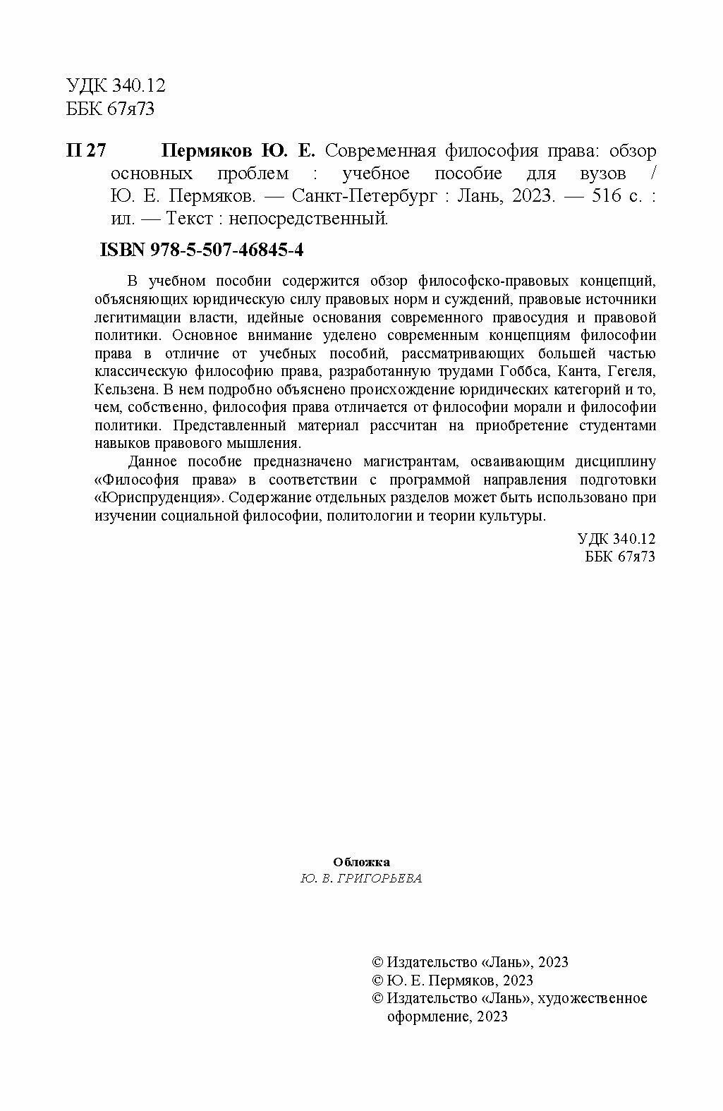 Современная философия права. Обзор основных проблем. Учебное пособие для вузов (Ю. Е. Пермяков); Издательство ЛАНЬ, 2025
