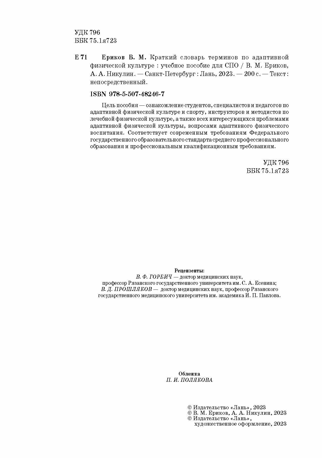 Краткий словарь терминов поадаптивной физической культуре (Владимир Михайлович Ериков); Издательство ЛАНЬ, 2023