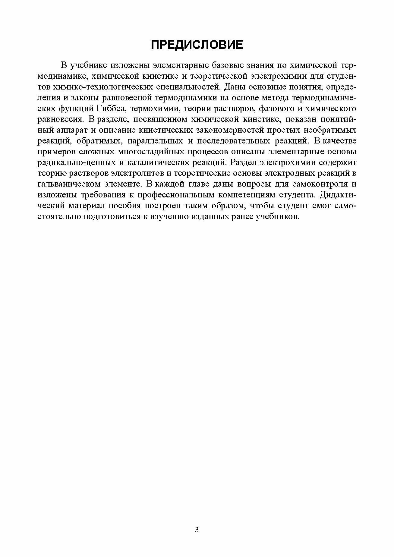 Учебник написан для студентов вузов химических и химико-технологических направлений, впервые приступающих к изучению физической химии. Здесь изложены основные понятия, определения и законы равновесной термодинамики, химической кинетики и электрохимии.