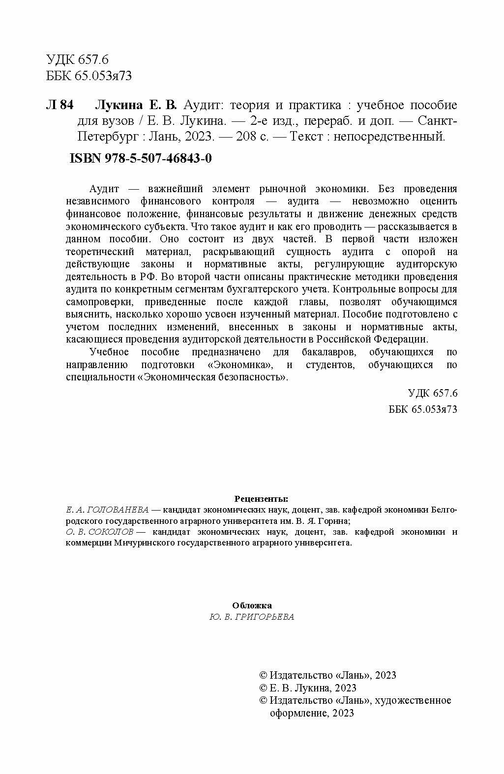 Аудит. Теория и практика. Учебное пособие для вузов (Е. В. Лукина); Издательство ЛАНЬ, 2023