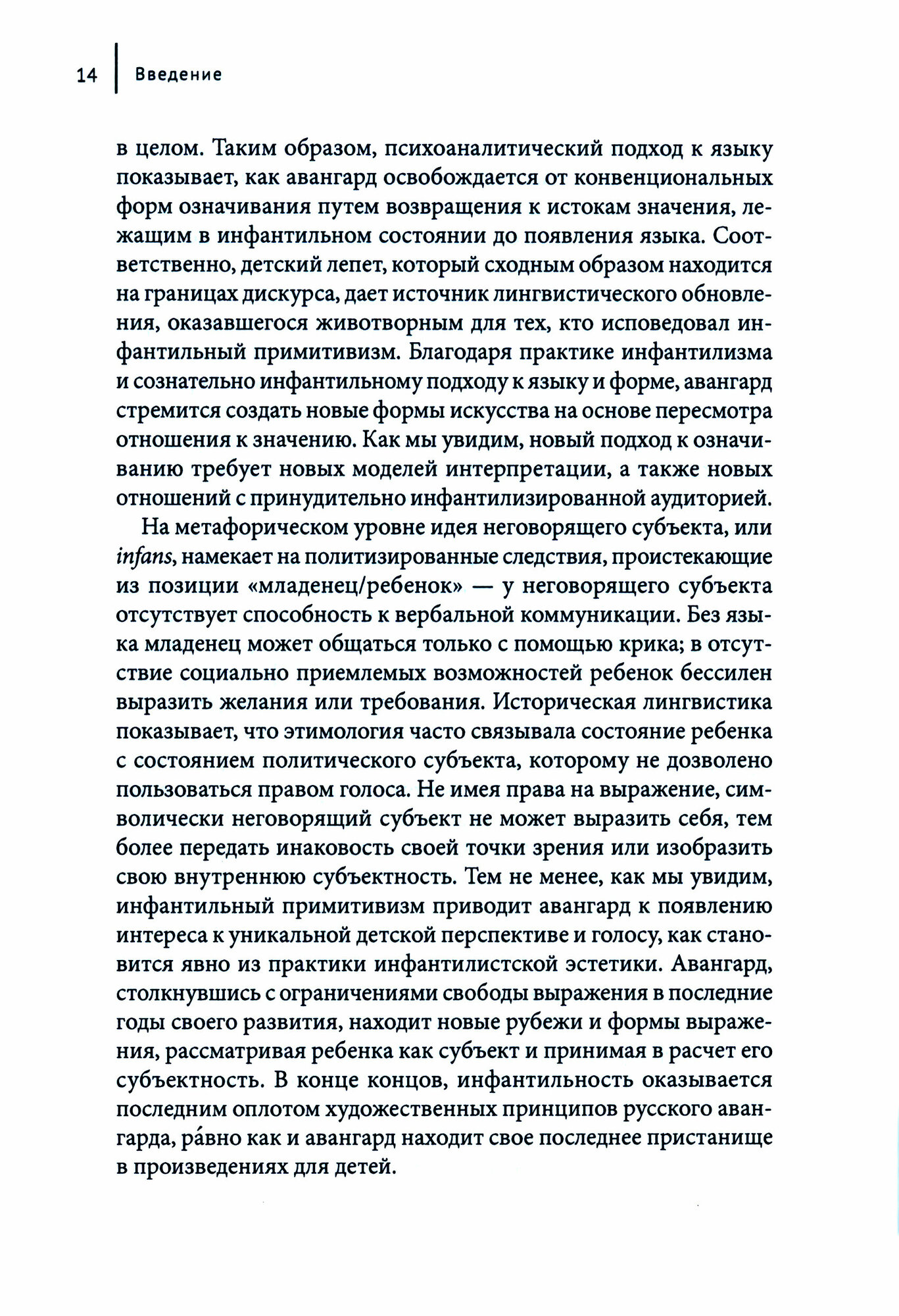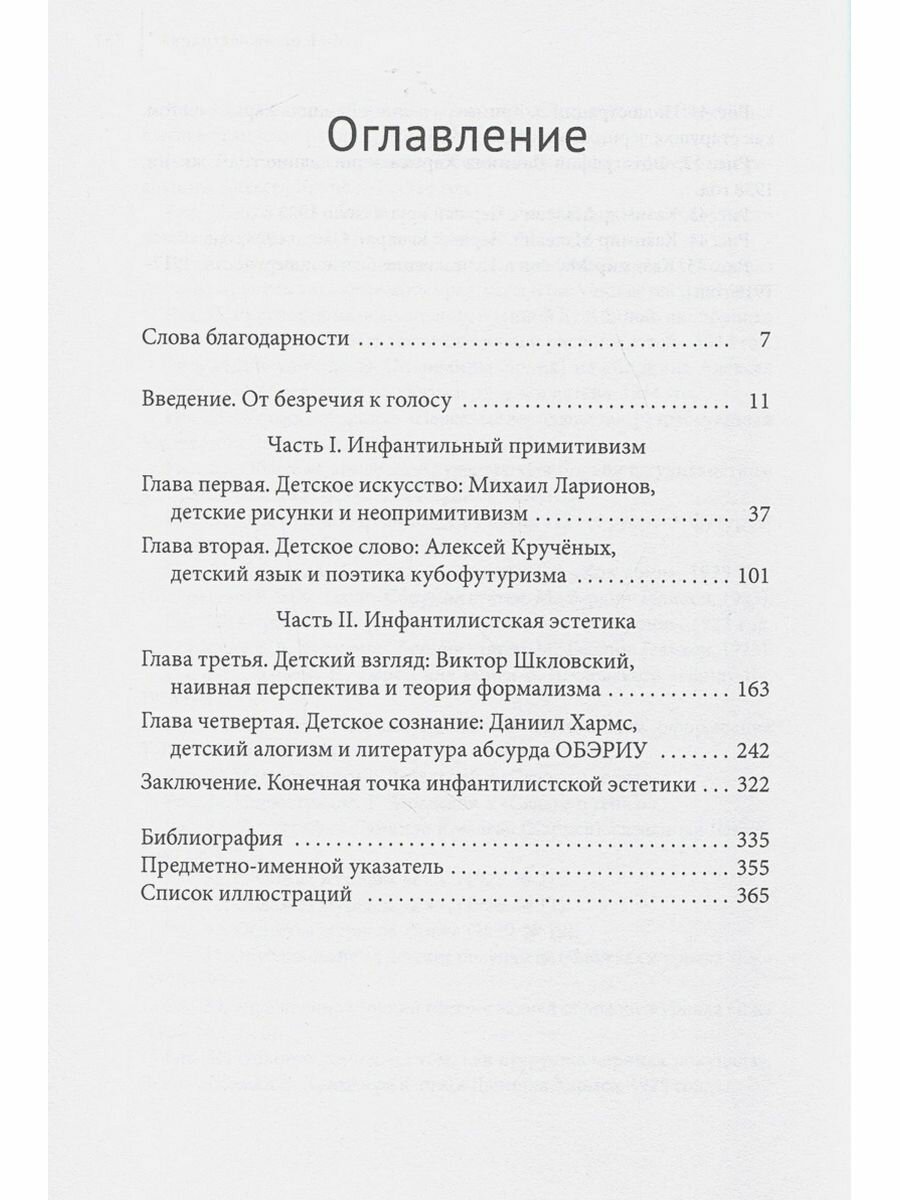 В книге рассматривается влияние детских рисунков на неопримитивистское искусство Михаила Ларионова, роль детского языка в кубофутуристической поэтике Алексея Крученых, использование наивной перспективы в формалистической теории Виктора Шкловского и место детской логики в абсурдистских сочинениях Даниила Хармса.