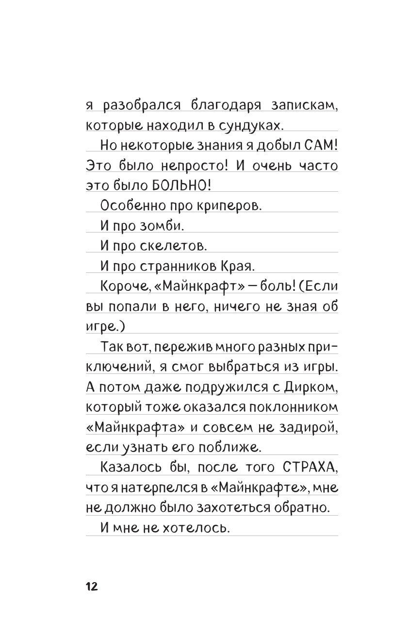 В руки Иры, Пети и Рудика попал необычный дневник, в котором неизвестный мальчик описал свои приключения в игре Майнкрафт. Но вот беда! Приключения закончились, так и не успев начаться, — ведьмы заточили его в башне. И только друзья, способные перемещаться из реального мира в игру, могут помочь игроку в беде. Их ждет насыщенное приключение, полное не только опасностей, но и неожиданных знакомств!