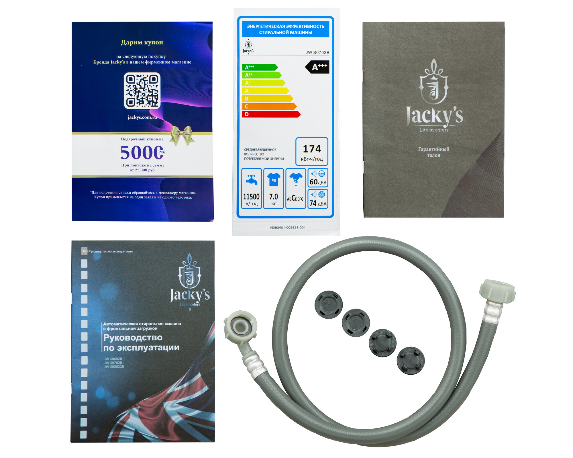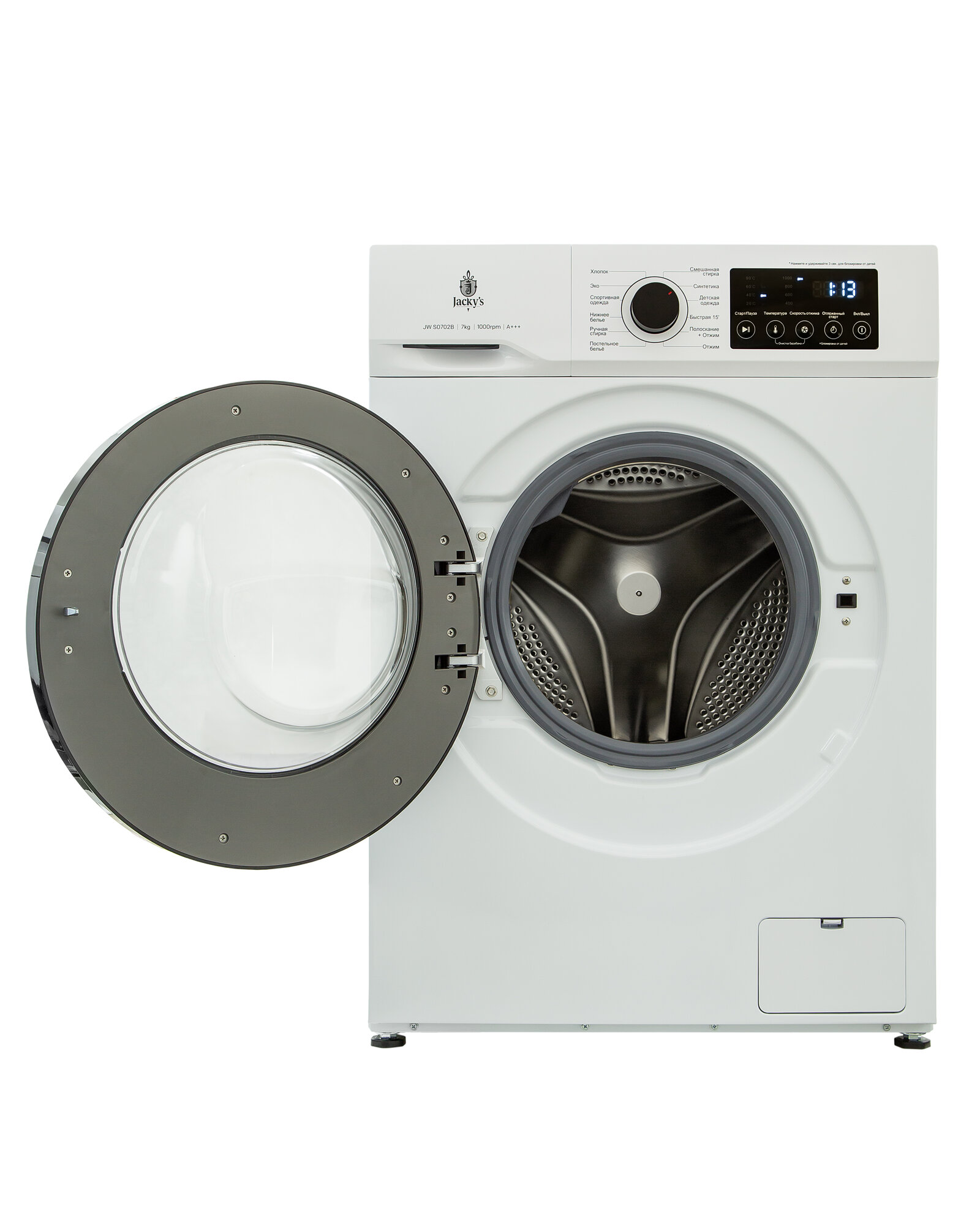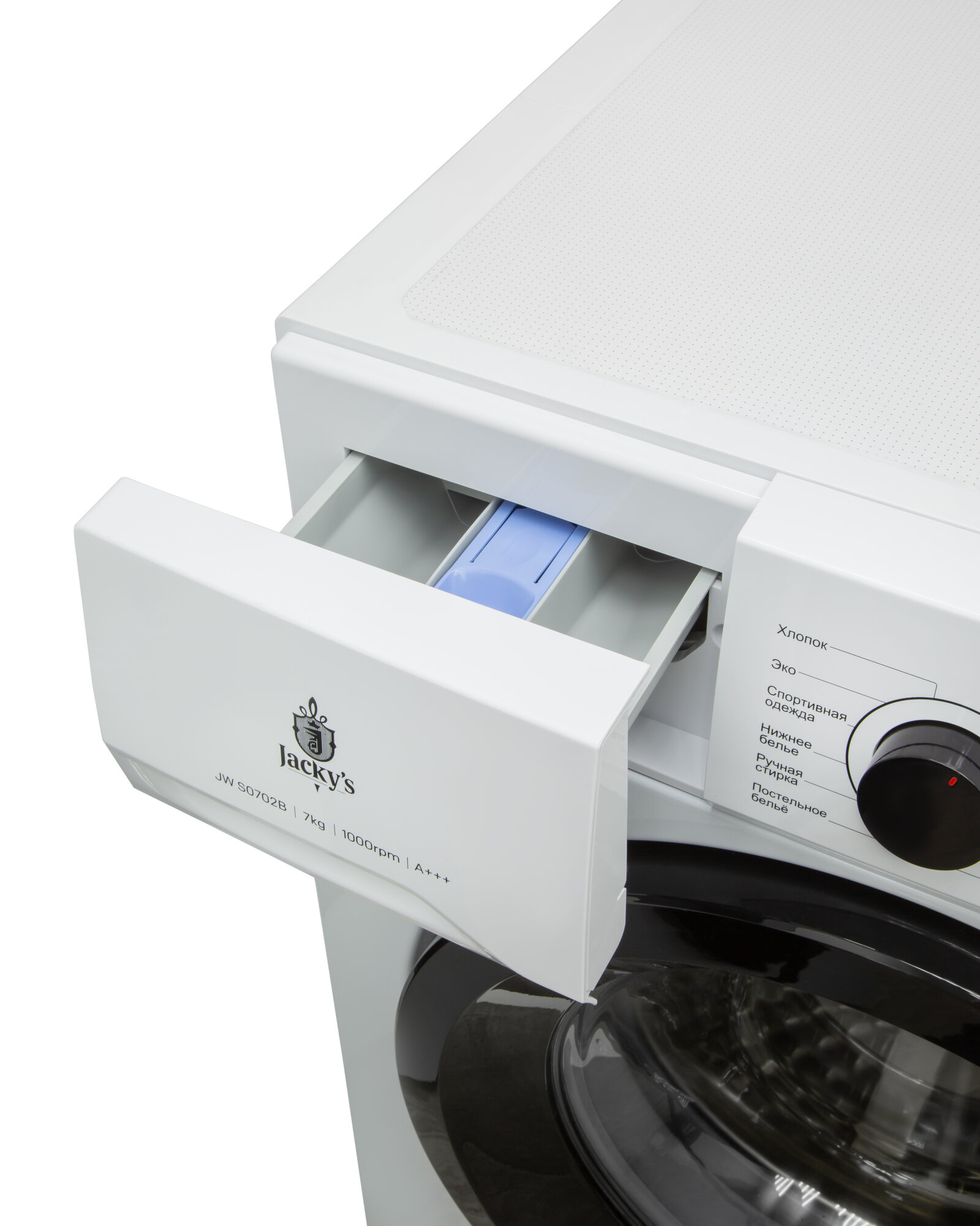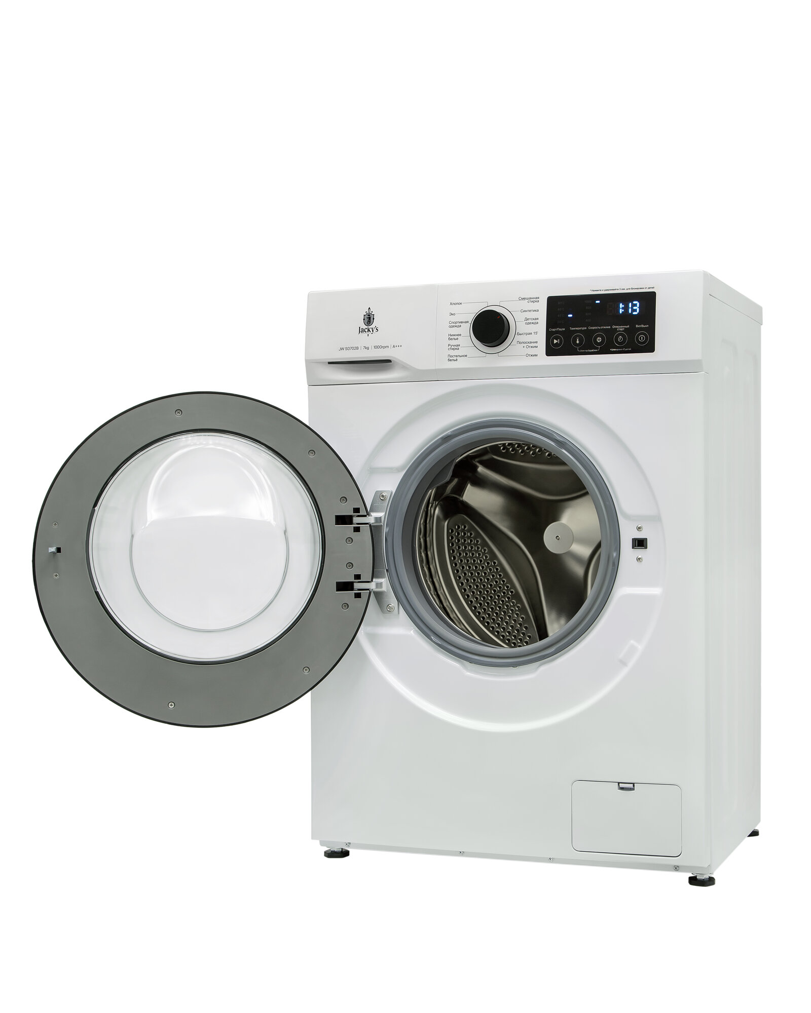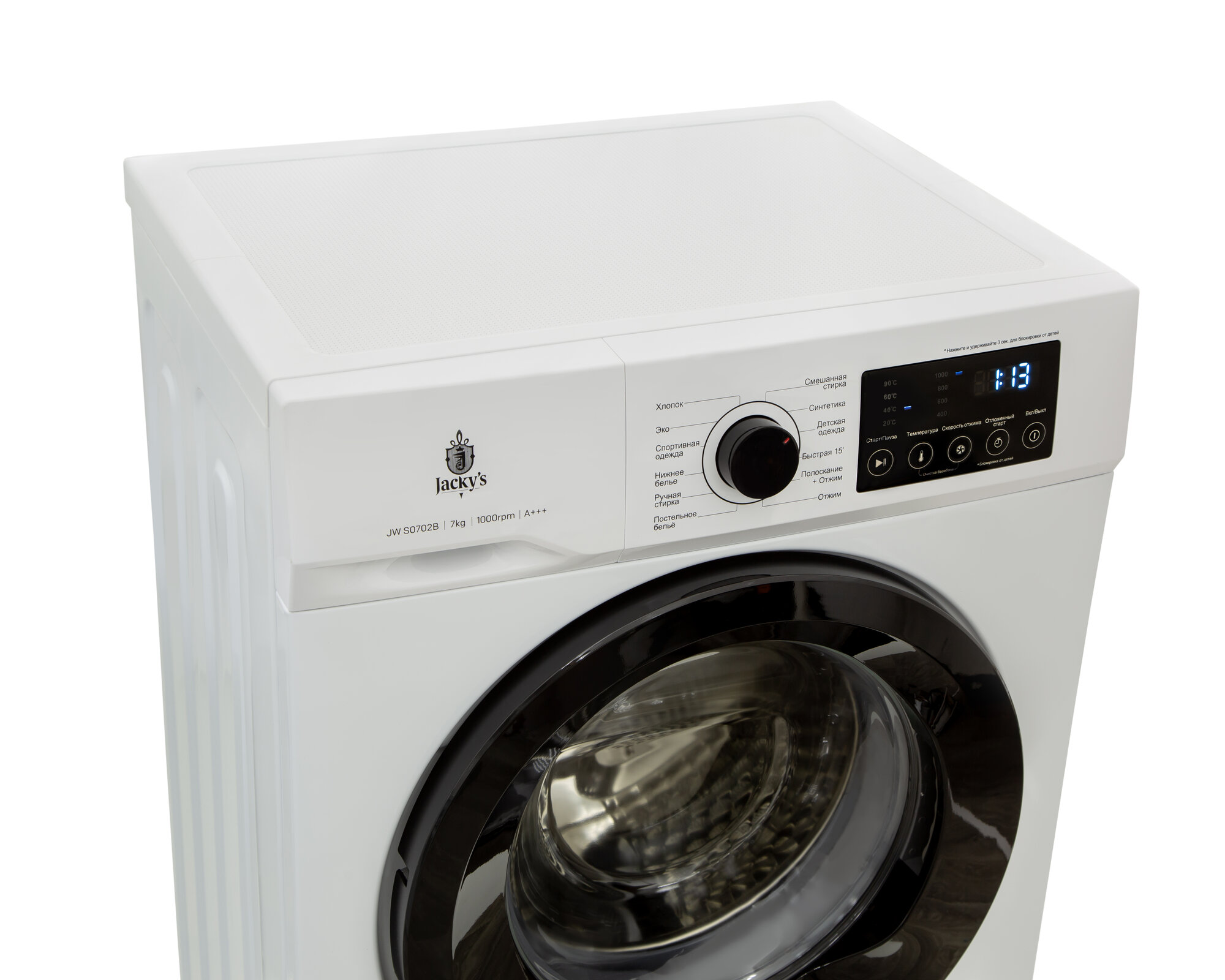 JACKY’S — современная модель стиральной машины в корпусе белого цвета, способной замечательно вписаться в любой интерьер. Объем барабана - 41 л, максимальная загрузка белья - 7 кг. Скорость отжима составляет 1000 об./мин. Ключевые преимущества: - Класс энергоэффективности А+++ экономит расход электричества - Барабан из нержавеющей стали, выполненный по технологиям Pebble Drum ® обеспечивает максимально эффективную и бережную стирку - Функция очистки барабана обеспечит долгую службу стиральной машины - Яркий и удобный цифровой дисплей Практичные функции: 1. Выбор скорости отжима обеспечивается как выбором соответствующей программы, так и возможностью ручного регулирования 2. Выбор температуры обеспечивается как выбором соответствующей программы, так и возможностью ручного регулирования. Вы сможете подобрать нужный температурный режим в соответствии с требованиями этикетки на белье 3. Отсрочка старта. Данная функция позволяет отложить начало стирки на более удобное для вас время, экономя электроэнергию 4. Система контроля дисбаланса зафиксирует неравномерное распределение вещей в барабане. В случае обнаружения дисбаланса, машина сама попробует разобраться с проблемой, при невозможности самостоятельного решения, машина остановит стирку во избежание поломок и предупредит об ошибке сообщением на дисплее 5. Система обнаружения неисправностей. В процессе стирки стиральные машины Jacky’s предупреждают об ошибке в эксплуатации или собственной неисправности сообщением на дисплее 6. Системы защиты от пены, перепадов напряжения и переливов предотвратят потенциальные риски затоплений и повреждений. Так, случайный избыток пены не проникнет в электронную панель управления, скачок электроэнергии не повредит двигатель, а объем воды не превысит максимально допустимый уровень 7. Замок от детей блокирует кнопки от вмешательства в процесс стирки 12 эффективных программ: Хлопок Экономичная Спорт Нижнее белье Шерсть/ручная стирка Перина Смешанные вещи Синтетика Детские вещи Ускоренная 15 минут Полоскание + отжим Отжим