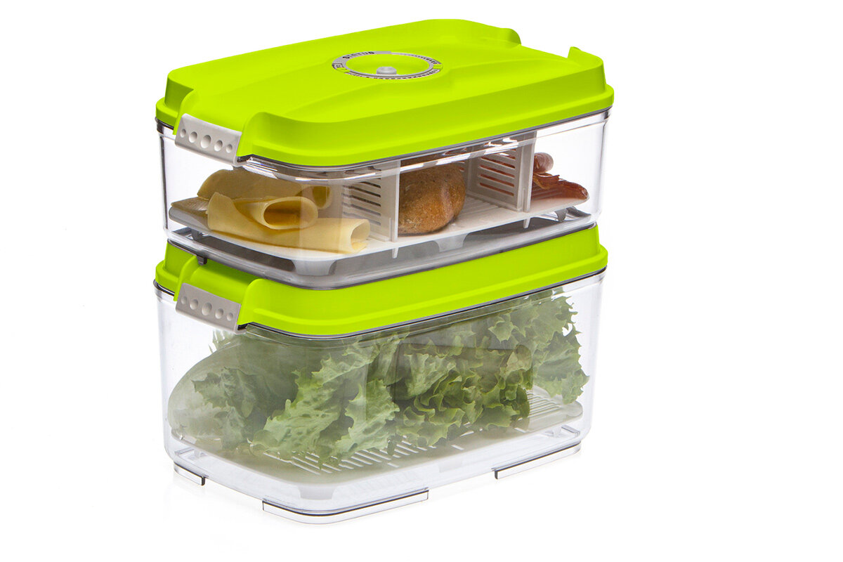 Комплектация: контейнеры 3,0 л, 4,5 л, ручной насос.Благодаря использованию вакуумных контейнеров, продукты не подвергаются внешнему воздействию и срок хранения значительно увеличивается. Продукты сохраняют свои вкусовые качества и аромат, а запахи в холодильнике не перемешиваются.Контейнеры для хранения продуктов в вакууме.Прямоугольная форма контейнеров.Индикатор даты (месяц, число).Рекомендовано хранение следующих продуктов: фрукты, овощи, хлеб, колбасы, сыры, сладости, соусы, супы.