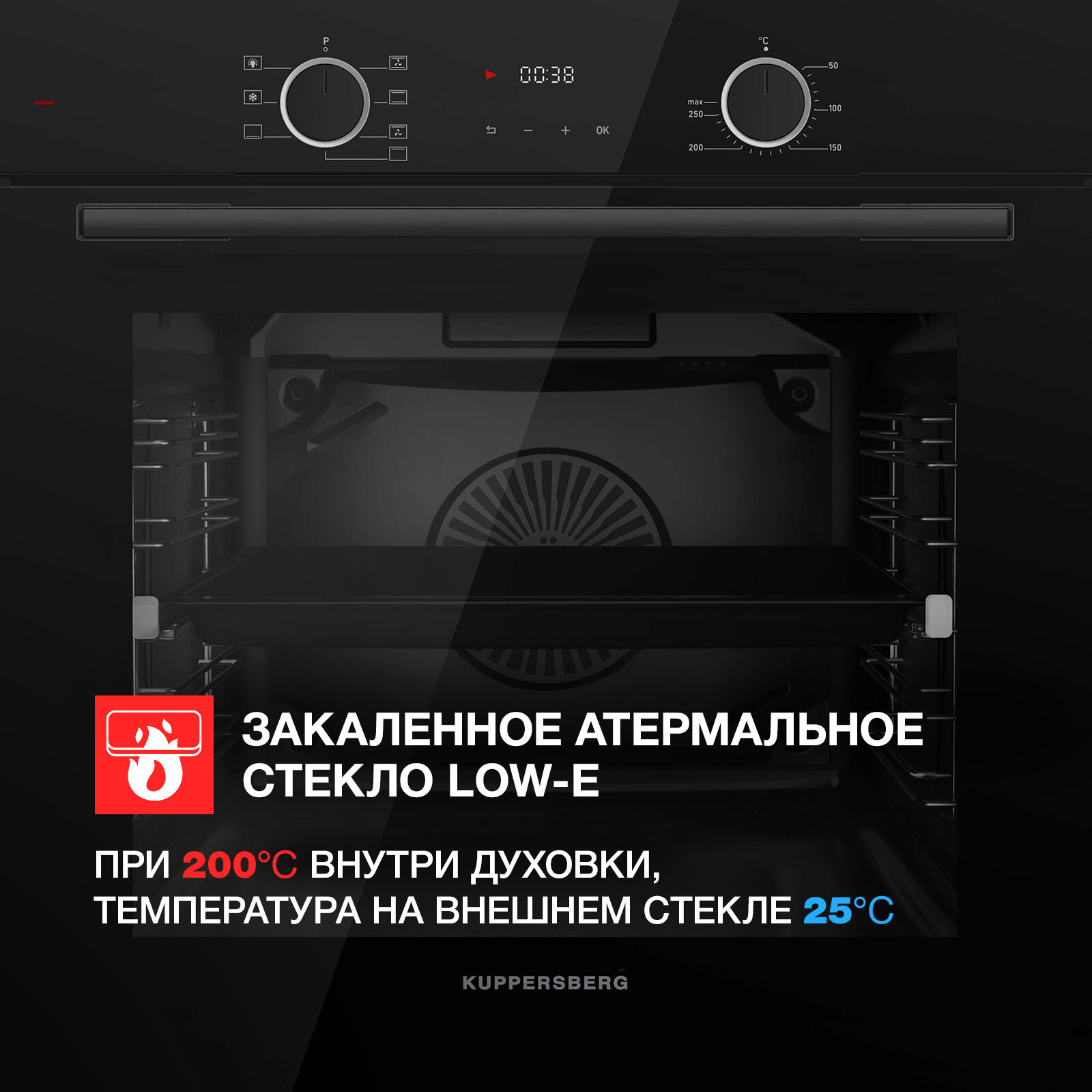 Первое внутреннее стекло Low-E - Стекло которое не выпускает тепловую энергию и является атермальным, благодаря чему, часть тепла возвращается обратно в камеру духовки, ускоряя нагревание, поддерживая нужный температурный уровень и оказывая содействие процессу приготовления блюд.