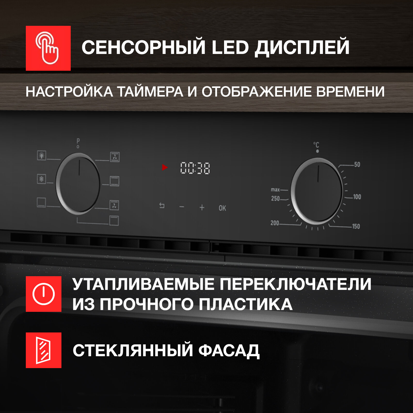 Фасад духового шкафа выполнен из закаленного стекла. Основные преимущества стеклянного фасада:
