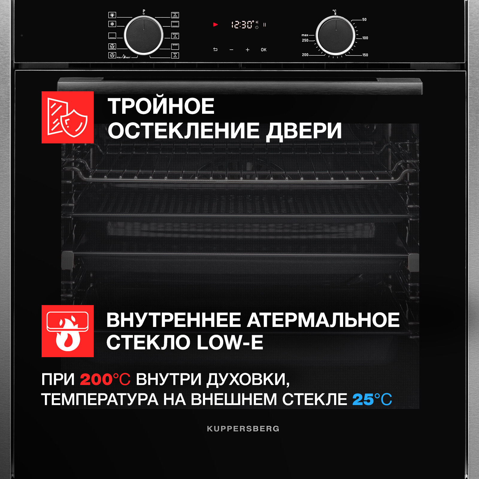 Первое внутреннее стекло Low-E - Стекло которое не выпускает тепловую энергию и является атермальным, благодаря чему, часть тепла возвращается обратно в камеру духовки, ускоряя нагревание, поддерживая нужный температурный уровень и оказывая содействие процессу приготовления блюд.