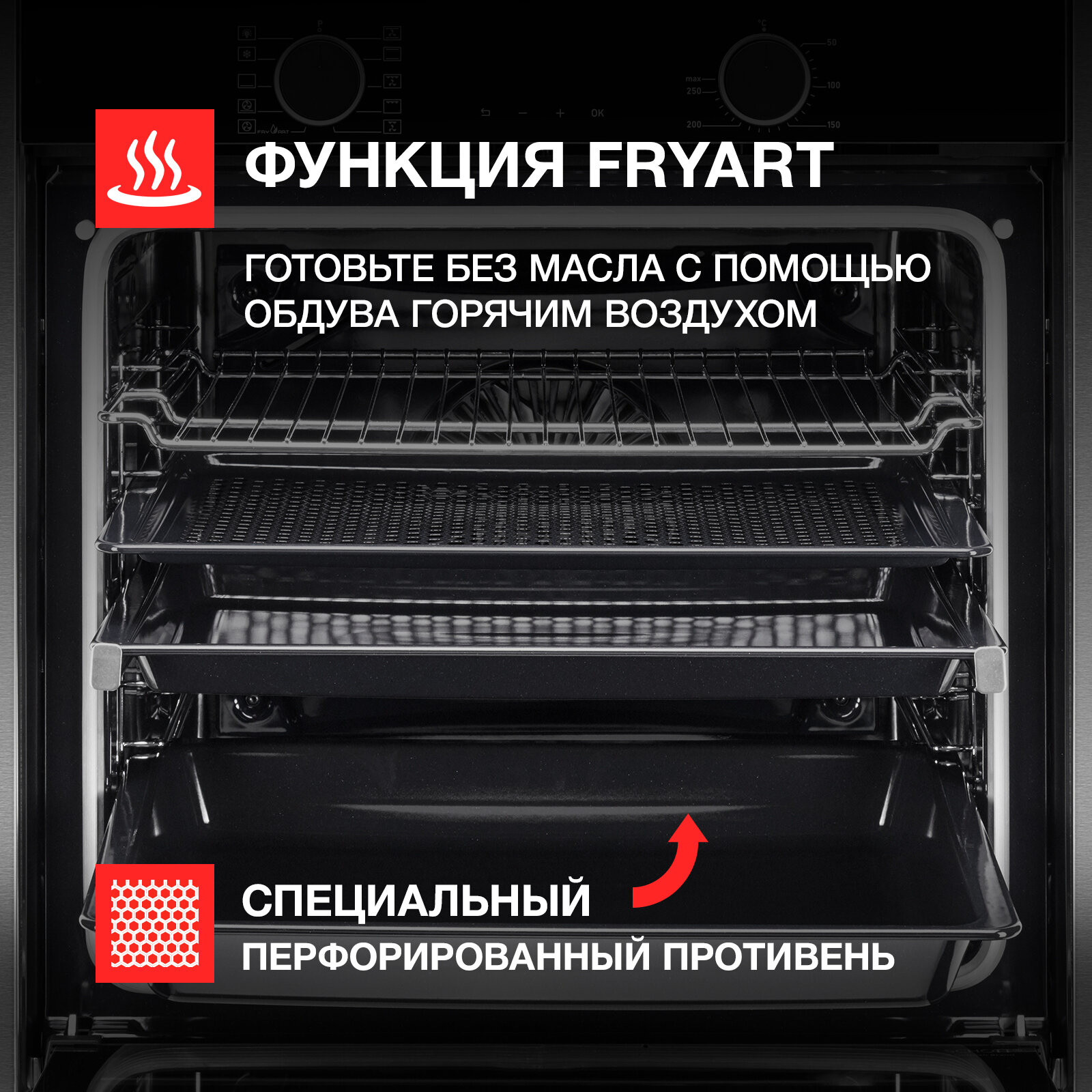 Особенность FryArt заключается в интенсивном запекании с помощью горячего воздуха. В сочетании со специальным перфорированным противнем можно получить хрустящую корочку со всех сторон блюда без необходимости переворачивания. Функция FryArt позволяет создавать вкуснейшие блюда и минимизировать количество используемого жира.