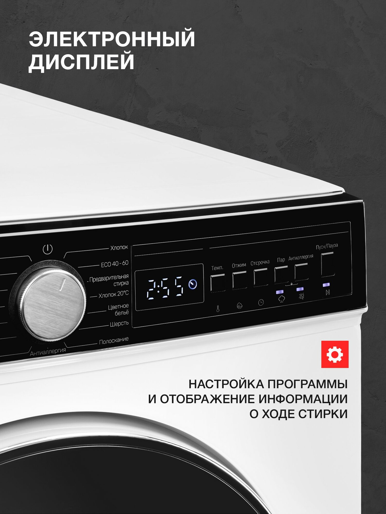 Большой и яркий LED-дисплей предельно ясно отображает информацию о настройках программ и текущем режиме работы стиральной машины. Простые и понятные обозначения помогут быстро разобраться в управлении