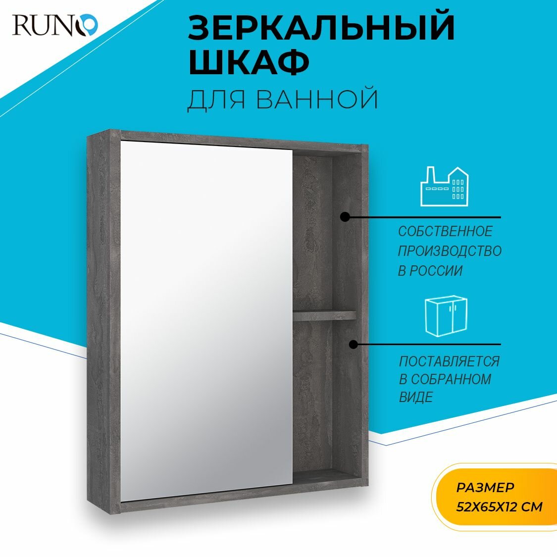Зеркальный шкаф для ванной RUNO ЭКО - превосходное решение для современного оснащения ванной комнаты. Зеркало для ванной ЭКО - это стильное сочетание текстуры серо-коричневого необработанного камня на корпусе из ЛДСП. Шкафчик в ванную имеет одну распашную дверцу с зеркальным фасадом и две открытые полки. Шкаф в ванную - универсальный (для смены ориентации изделие поворачивается на 180 градусов). Внутри шкафа - одна внутренняя полка. Мебель для ванной RUNO - красота и практичность в мелочах! Цвет товара на мониторе может отличаться от реальных цветов, это зависит от настроек цветового профиля и разрешения Вашего монитора или мобильного устройства.