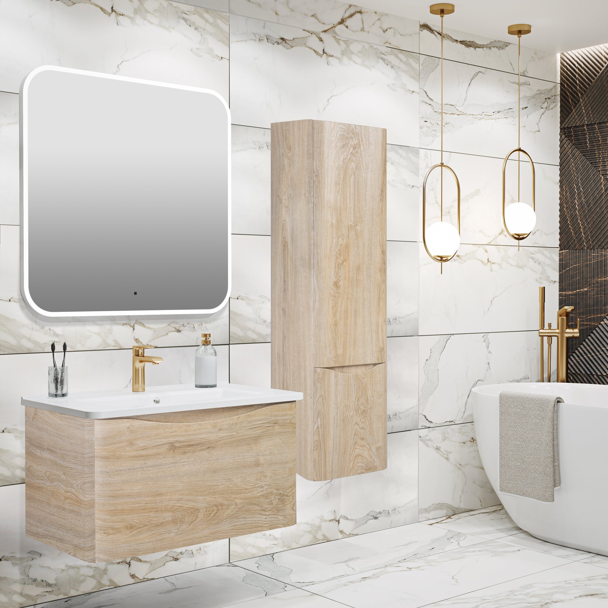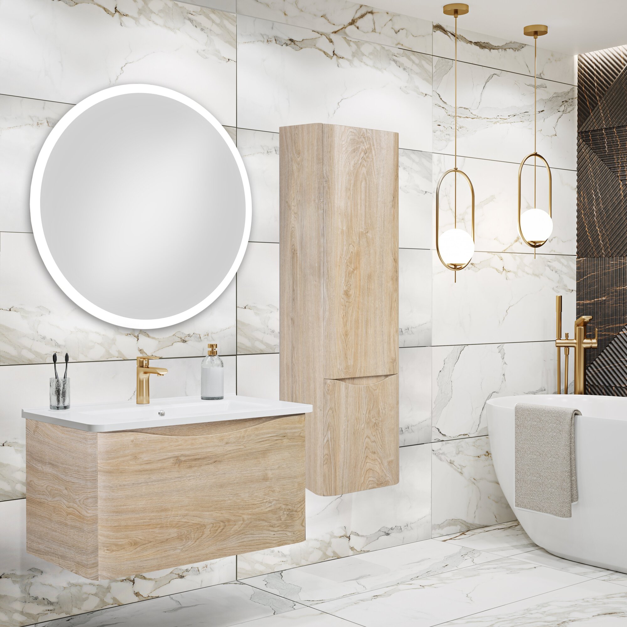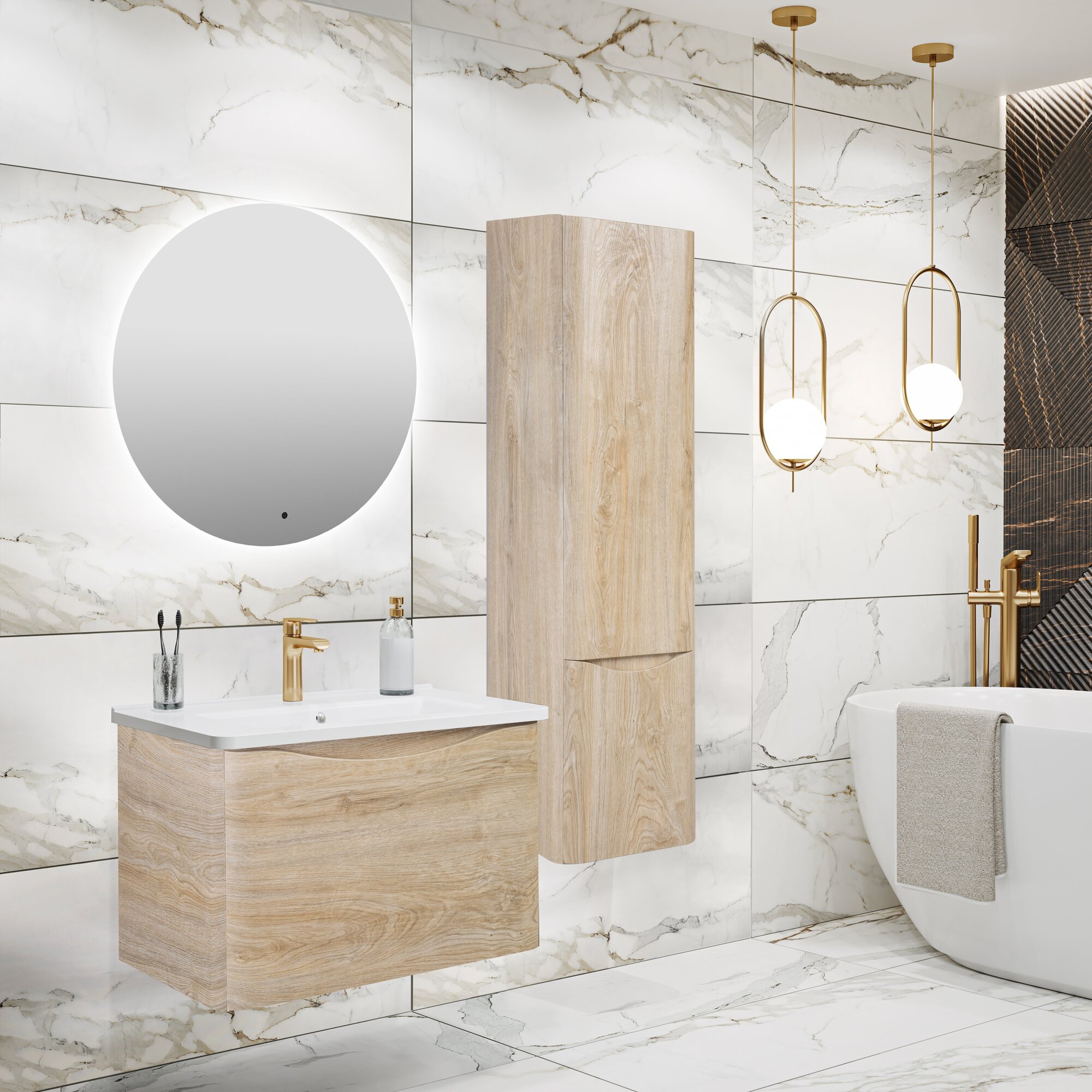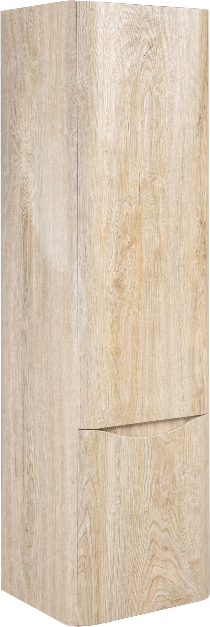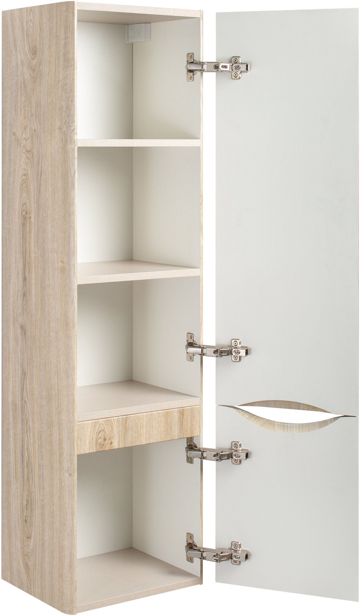 Шкаф пенал для ванной комнаты RUNO тоскана (подвесной) - выполнена в ультрасовременном дизайне в цвете светлое дерево. Пенал отличается изысканным дизайном, скруглённые углы, древесная текстура фасада, врезная ручка – придают шкафу необычный и незабываемый внешний вид. Шкаф в ванную комнату оснащён двумя распашными дверцами, в верхнем отделении две встроенные полки. Каждая дверца укомплектована двумя петлями, верхняя с доводчиком, нижняя без доводчика. Мебель для ванной RUNO - красота и практичность в мелочах!