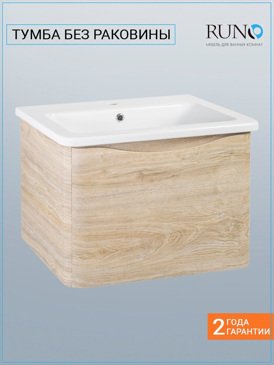 Тумба под раковину в ванную RUNO ТОСКАНА (подвесная) - выполнена в ультрасовременном дизайне в цвете светлое дерево. Тумба под раковину отличается изысканным дизайном, скруглённые углы тумбы, древесная текстура фасада, фрезерованная ручка – придают мебели необычный и незабываемый внешний вид. Тумба в ванную оснащена выдвижным ящиком на шариковых направляющих, с системой плавного закрывания. Тумба под раковину ТОСКАНА гармонично впишется в любой интерьер ванной комнаты. К тумбе для ванной подходит накладной керамический умывальник Никсон 60 (600х460 мм) ТМ Dreja, необычный дизайн которого сочетание строгих линий прямоугольника со скруглёнными углами, отражают современные тренды в дизайне. Раковина глубиной 16 см. Мебель для ванной комнаты RUNO - красота и практичность в мелочах!