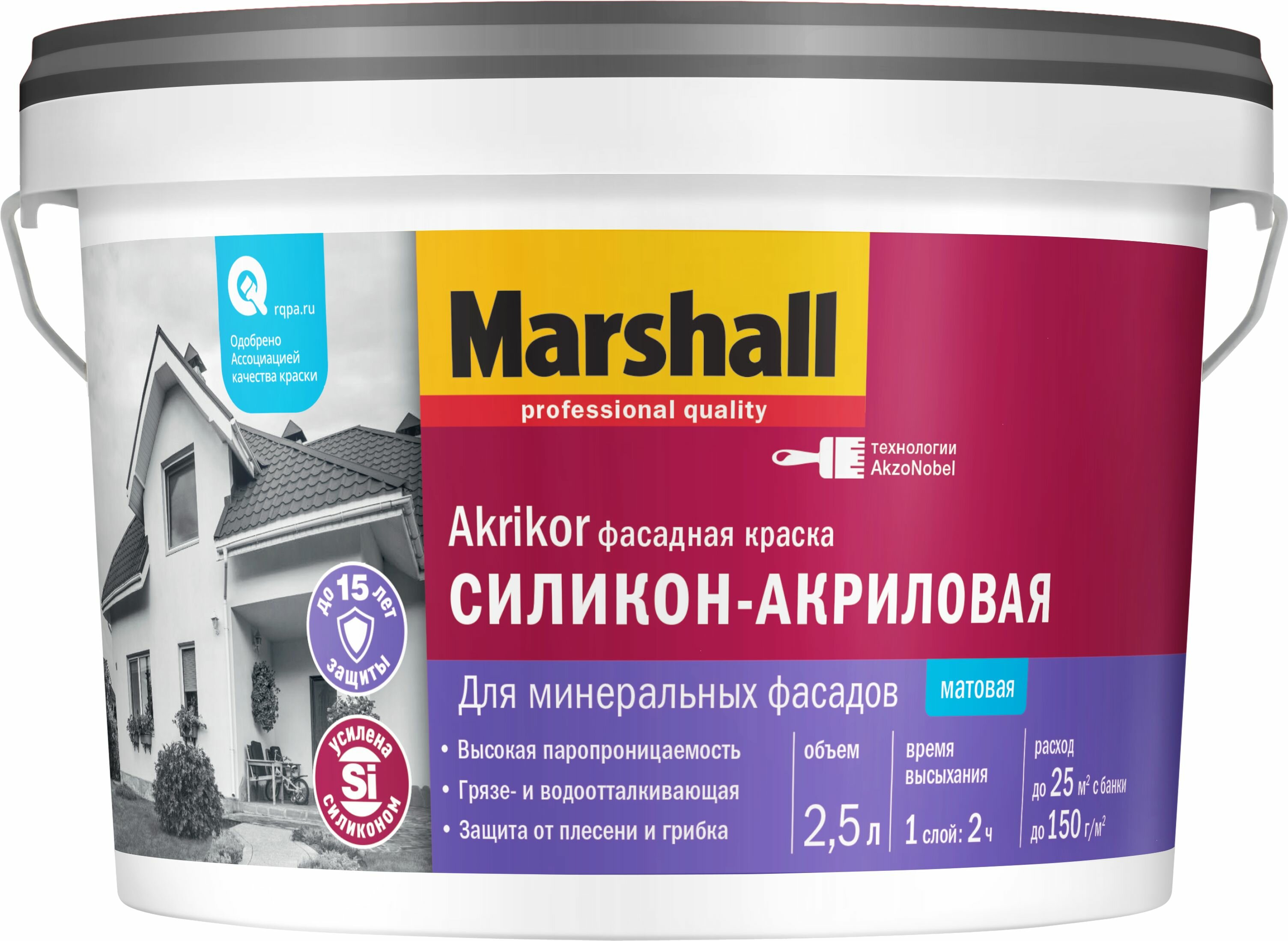 **Краска для колеровки Marshall Akrikor база BW** предназначена для проведения наружных работ. Используется для нанесения на минеральные, кирпичные, бетонные и оштукатуренные фасады. Обеспечивает защиту от образования плесени и грибка, обладает грязи и водоотталкивающими свойствами. Перед нанесением основание защищают. Для высыхания каждого слоя требуется около 2 часов. Расход — до 150 г/м². Состав: пигменты, вода, сополимерная дисперсия, наполнители, функциональные добавки, силиконовые добавки, добавки против грибка и водорослей.