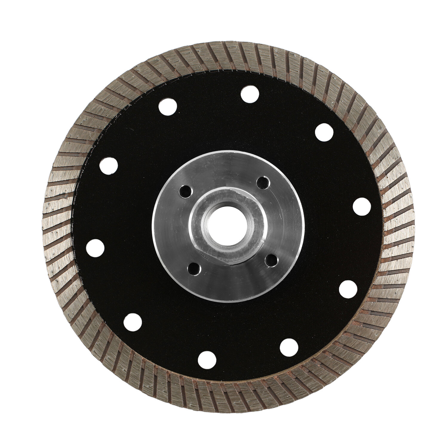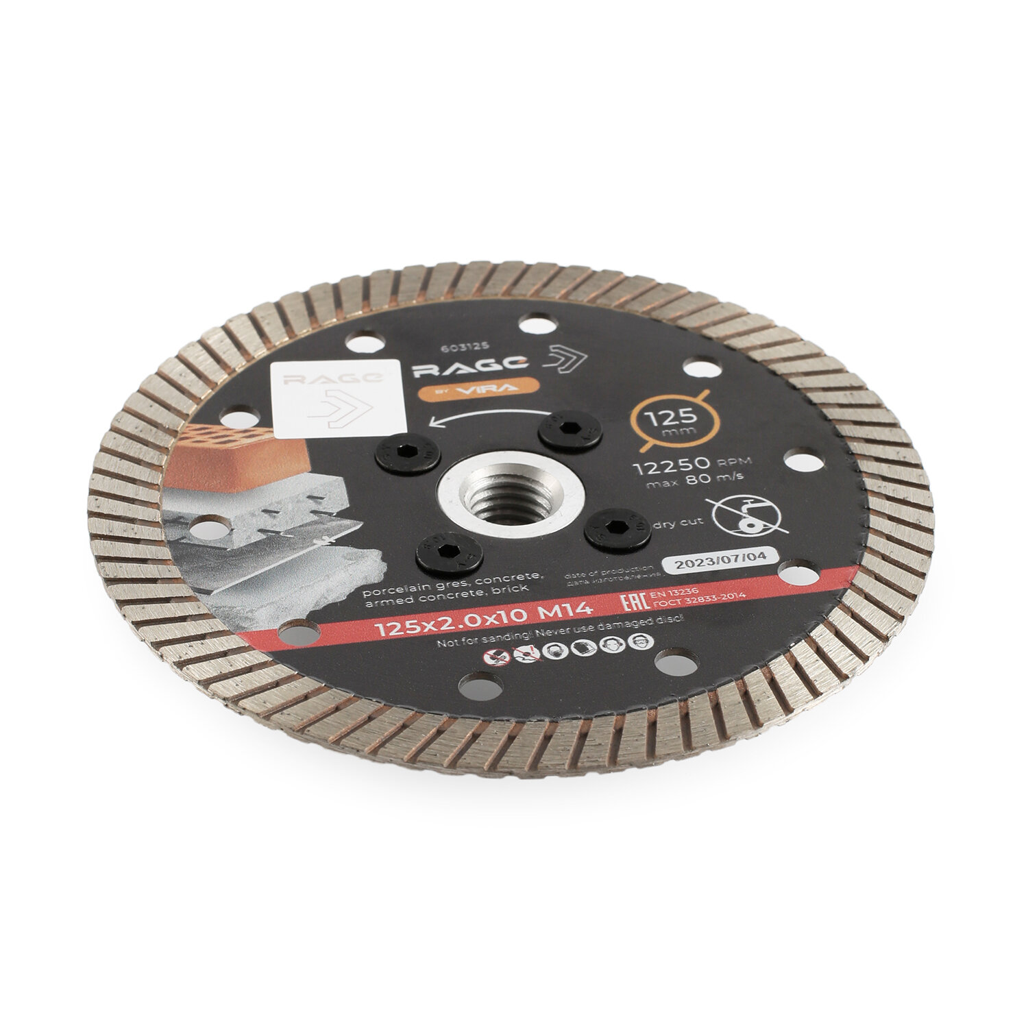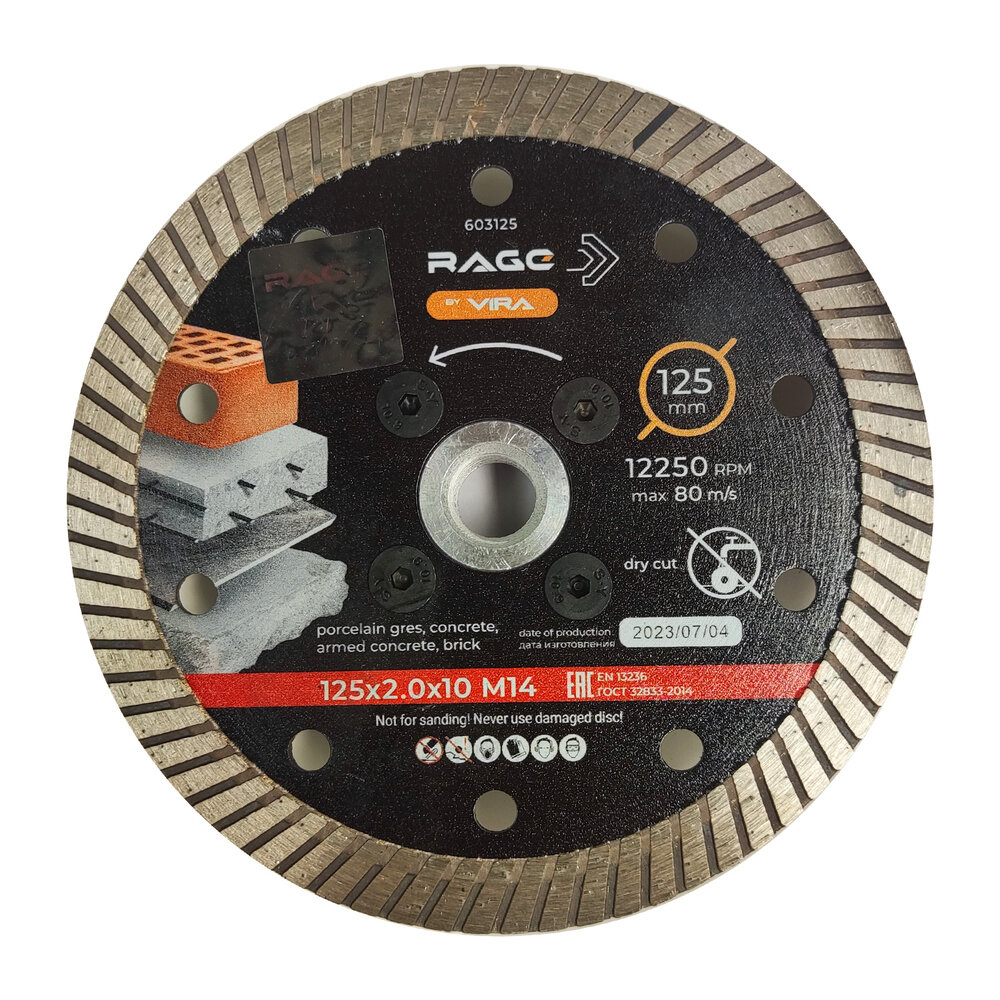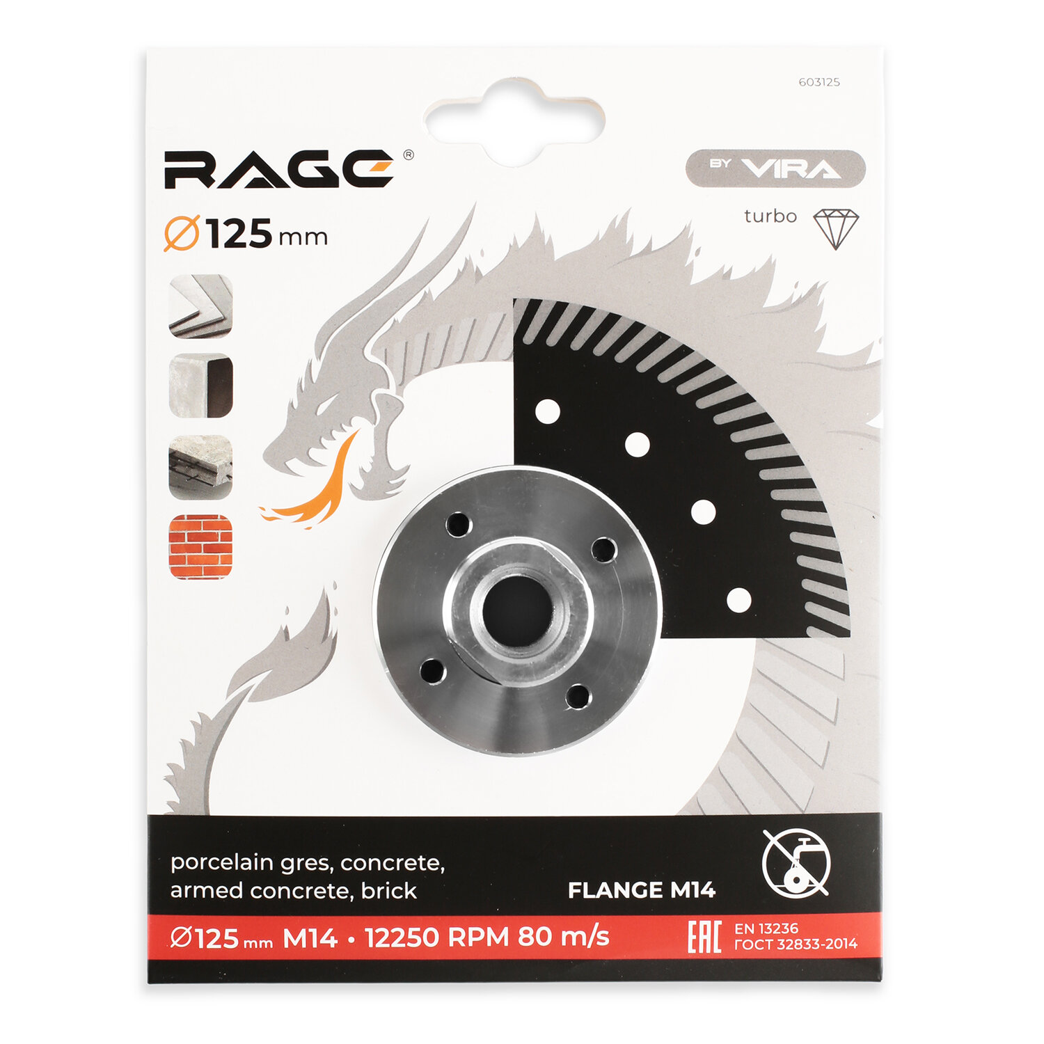 **Диск алмазный турбо с фланцем Rage** изготовлен методом горячего прессования. Наличие фланца М14 позволяет устанавливать данный диск на УШМ без зажимной гайки, но и значительно усиливает корпус диска, что дает возможность работать с материалом под любым углом, создавая дополнительные возможности в работе.