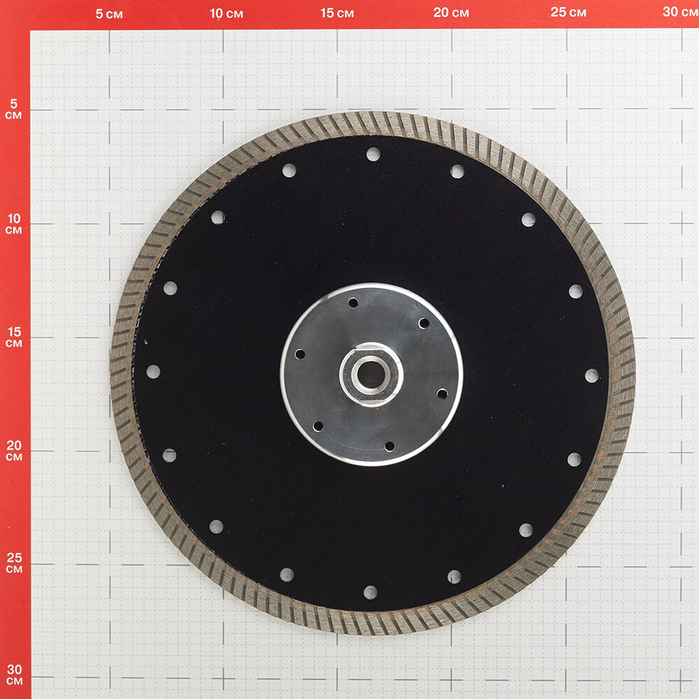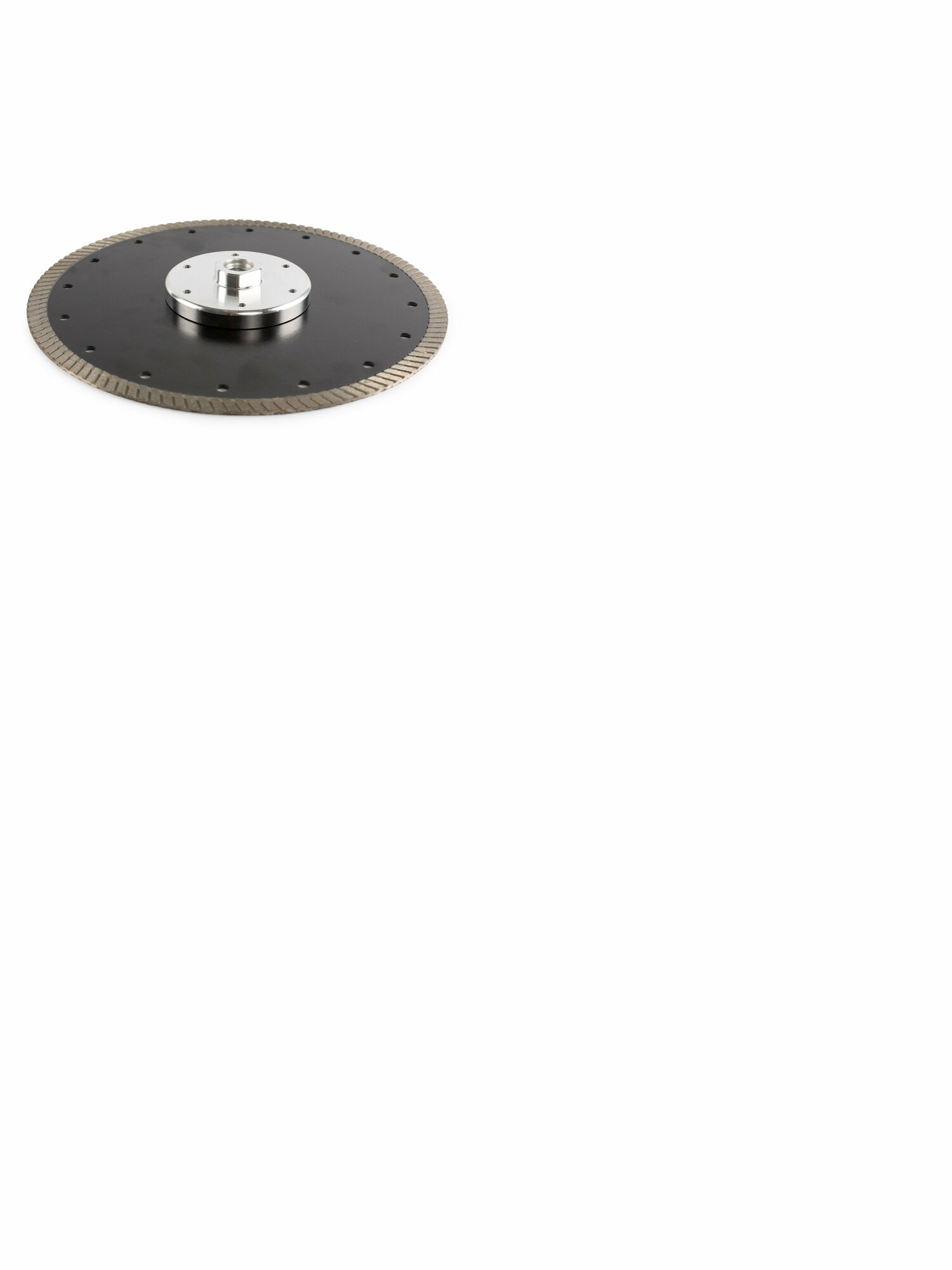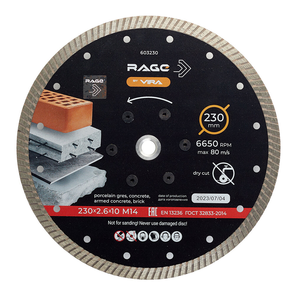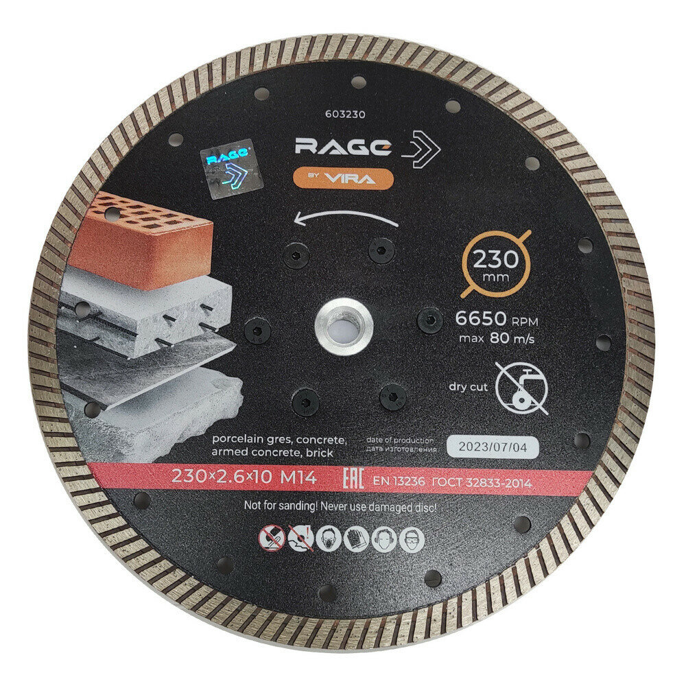 **Диск алмазный турбо с фланцем Rage** изготовлен методом горячего прессования. Наличие фланца М14 позволяет устанавливать данный диск на УШМ без зажимной гайки, но и значительно усиливает корпус диска, что дает возможность работать с материалом под любым углом, создавая дополнительные возможности в работе.