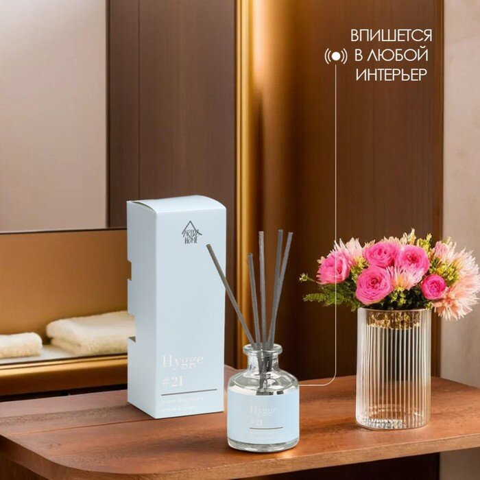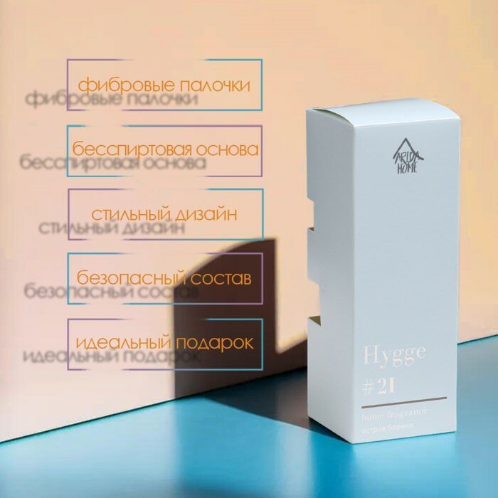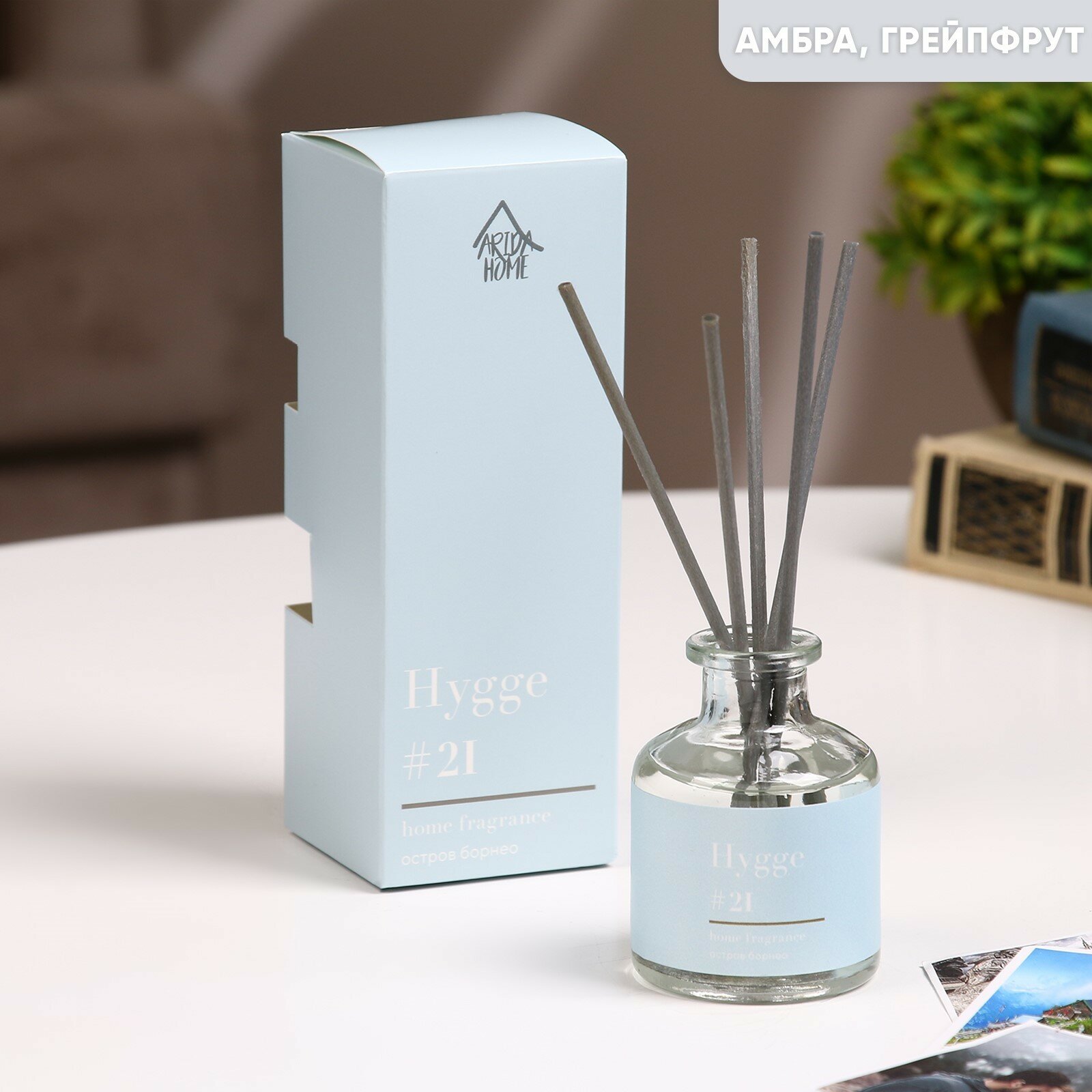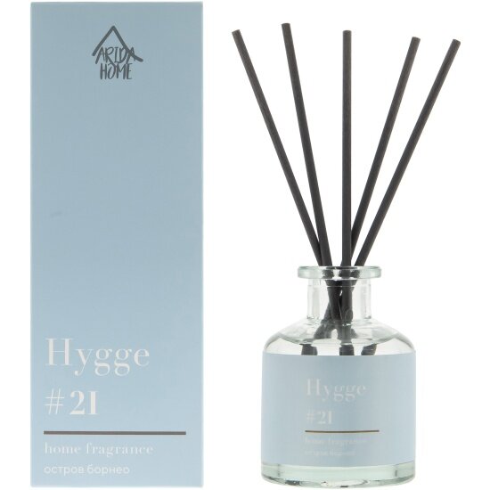 **Ароматический диффузор Arida Home Hygge 21** — это флакон с ароматической жидкостью, предназначенной для придания приятного запаха помещению. Для применения открыть флакон, вставить все фибровые палочки, периодически переворачивая их. Во влажных помещениях срок службы значительно сокращается. Жидкость воспламеняемая, поэтому ее следует беречь от открытого огня.