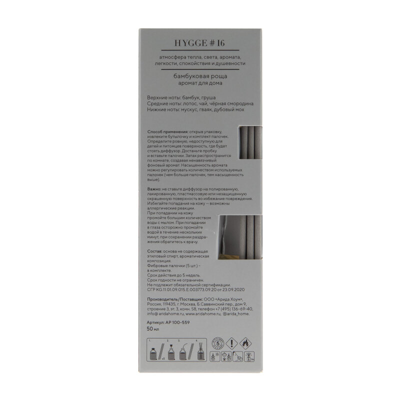 | Состав комплекта | Картонная коробка, стеклянная бутылочка, ароматическая жидкость,фибровые палочки 5 шт |