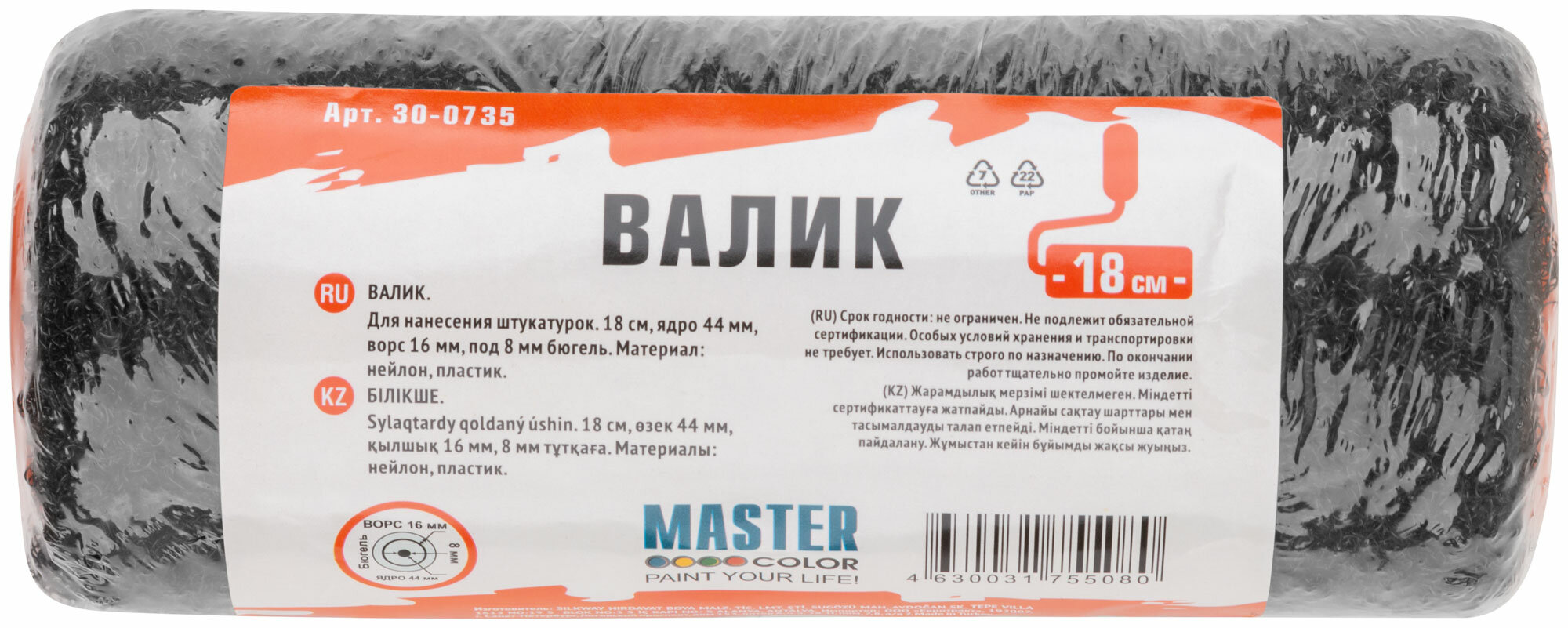 **Валик для нанесения штукатурок Master Color** представляет собой инструмент для отделочных работ. С его помощью можно нанести штукатурку на поверхность стены или потолка. Валик обеспечивает равномерное нанесение шпатлевки, позволяет значительно уменьшить время работы. У ворса устойчивая структура, поэтому малярный инструмент не оставляет ворсинок на стенах и потолке.