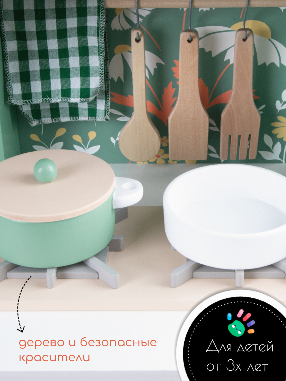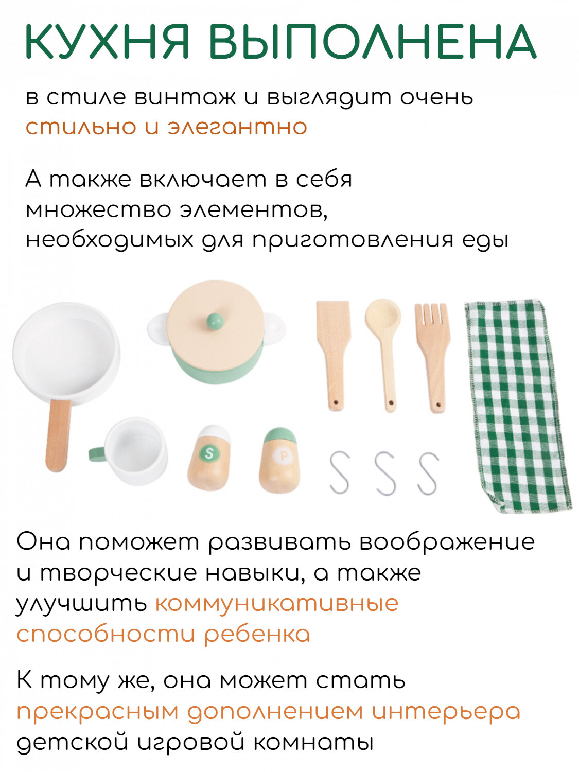 Деревянная кухня в стиле ретро включает в себя множество функциональных зон, таких как раковина, плита, шкафы, посудомоечная машина и многое другое. На меловой доске дети могут записывать ингредиенты, которые им нужны для приготовления своего кулинарного шедевра. 15 кухонных аксессуаров, включая посуду для приготовления еды.