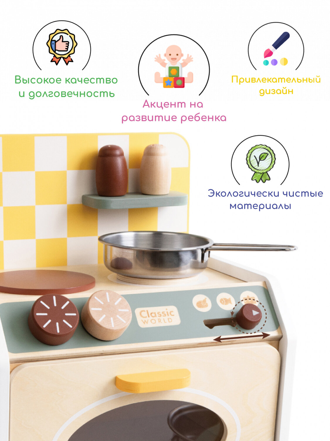 Элементы управления очень удобны в использовании, а аксессуары (сковорода, кастрюля, полотенце, лопатка, соль и перец) позволяют готовить всевозможные вкусные блюда.