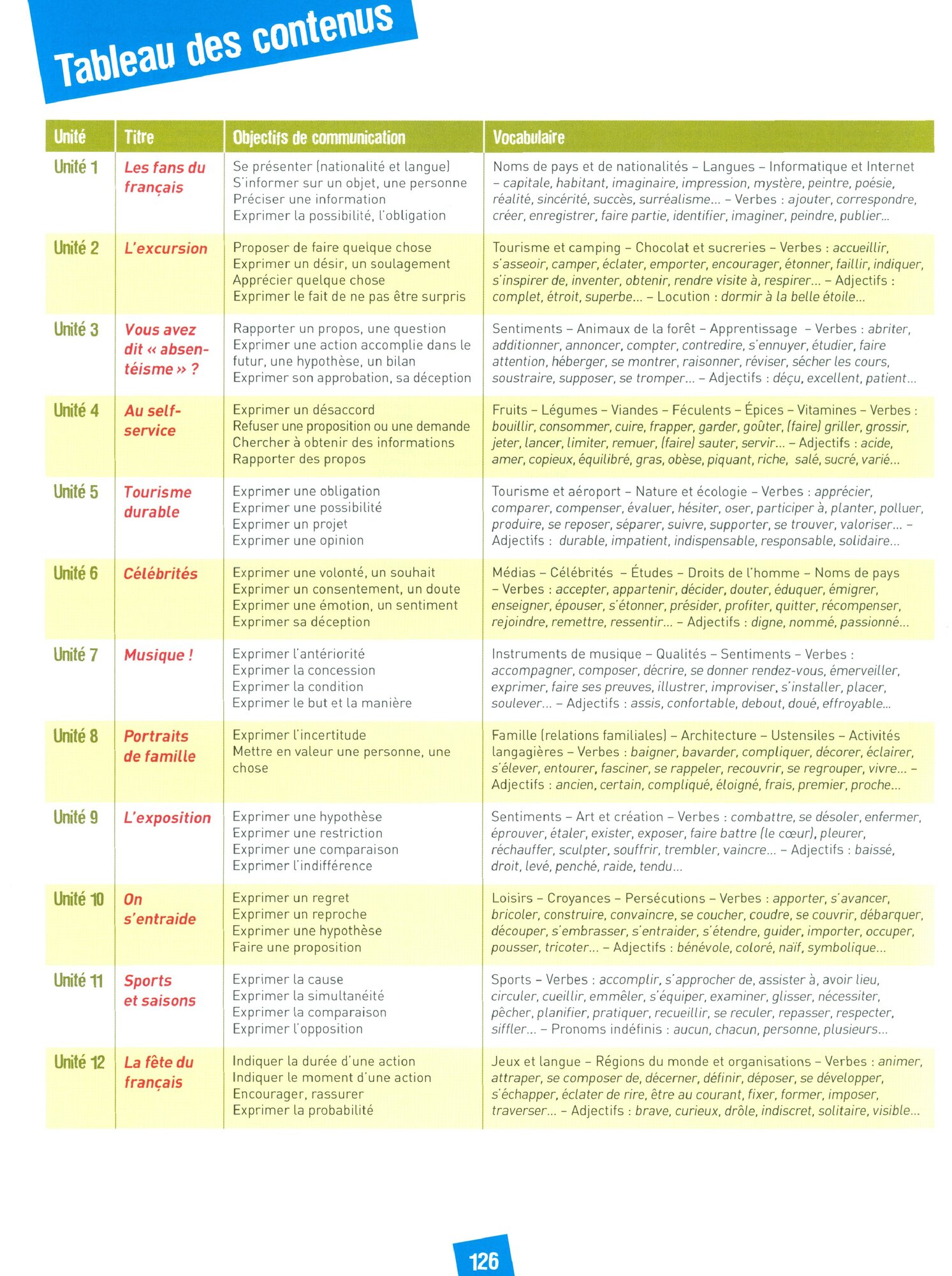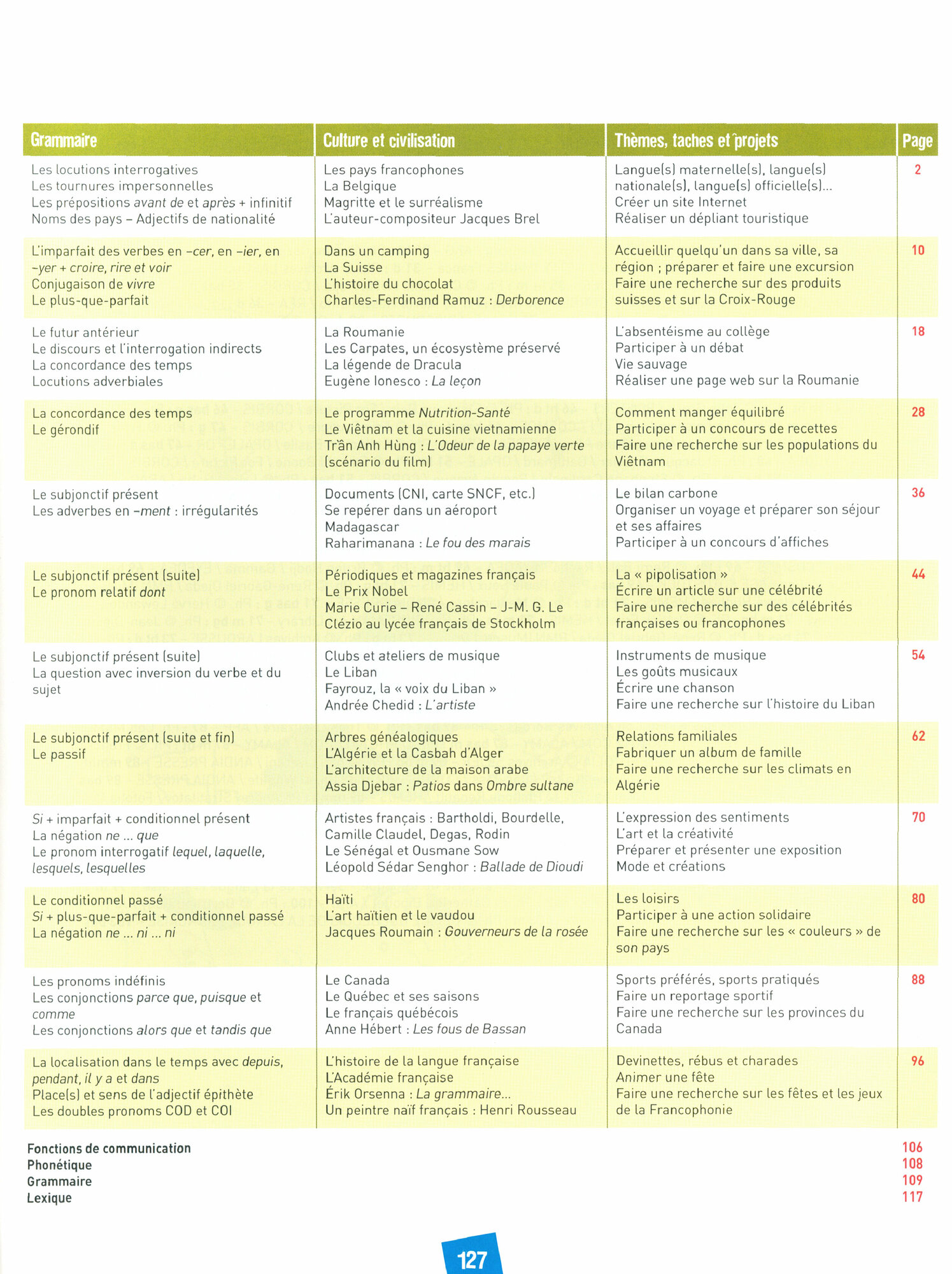 Chaque unite se termine par une double page de recapitulation desacquis en grammaire, vocabulaire, phonetique, actes de paroles et strategies d'apprentissage.La presentation des contenus culturels propose une pedagogie actionnelle a partir de taches qui invitent les eleves a comparer ces contenus avec leur propre culture.