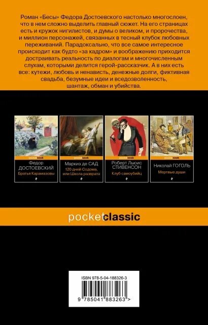 «Бесы» Достоевского — это захватывающее и заставляющее задуматься исследование самых темных глубин человеческой психики. Роман с его сложными персонажами, интенсивным философским дискурсом и напряженным сюжетом углубляется в темы политических потрясений, идеологического фанатизма и моральных ценностей. Мастерское повествование и психологическая проницательность Достоевского делают «Бесов» убедительным и незабываемым литературным произведением».