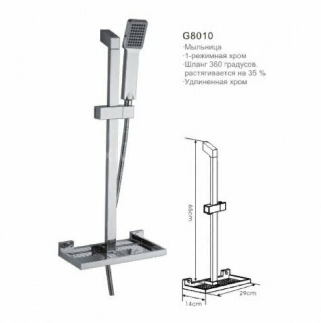 | Комплектация | держатель для душа; крепеж; лейка для душа; мыльница; шланг для душа; штанга |