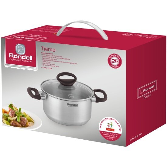 Кастрюля Rondell Tierno RDS-1592 объемом 2.8 л представляет собой универсальную помощницу, которой вы доверите приготовление первых и вторых блюд, а также различных соусов и аппетитных подлив. Корпус ассистентки выполнен с использованием нержавеющей стали – материала, который гарантирует равномерное распределение тепла по поверхности для ускорения кулинарного процесса и сохранения полезных свойств продуктов.Кастрюля Rondell Tierno RDS-1592 укомплектована крышкой из закаленного стекла, устойчивого к образованию повреждений при регулярном термическом воздействии. Удобству в процессе ежедневного использования способствуют бакелитовые ручки с Soft Touch-покрытием. Внутренние отметки литража помогут наполнить посуду необходимым объемом жидкости.