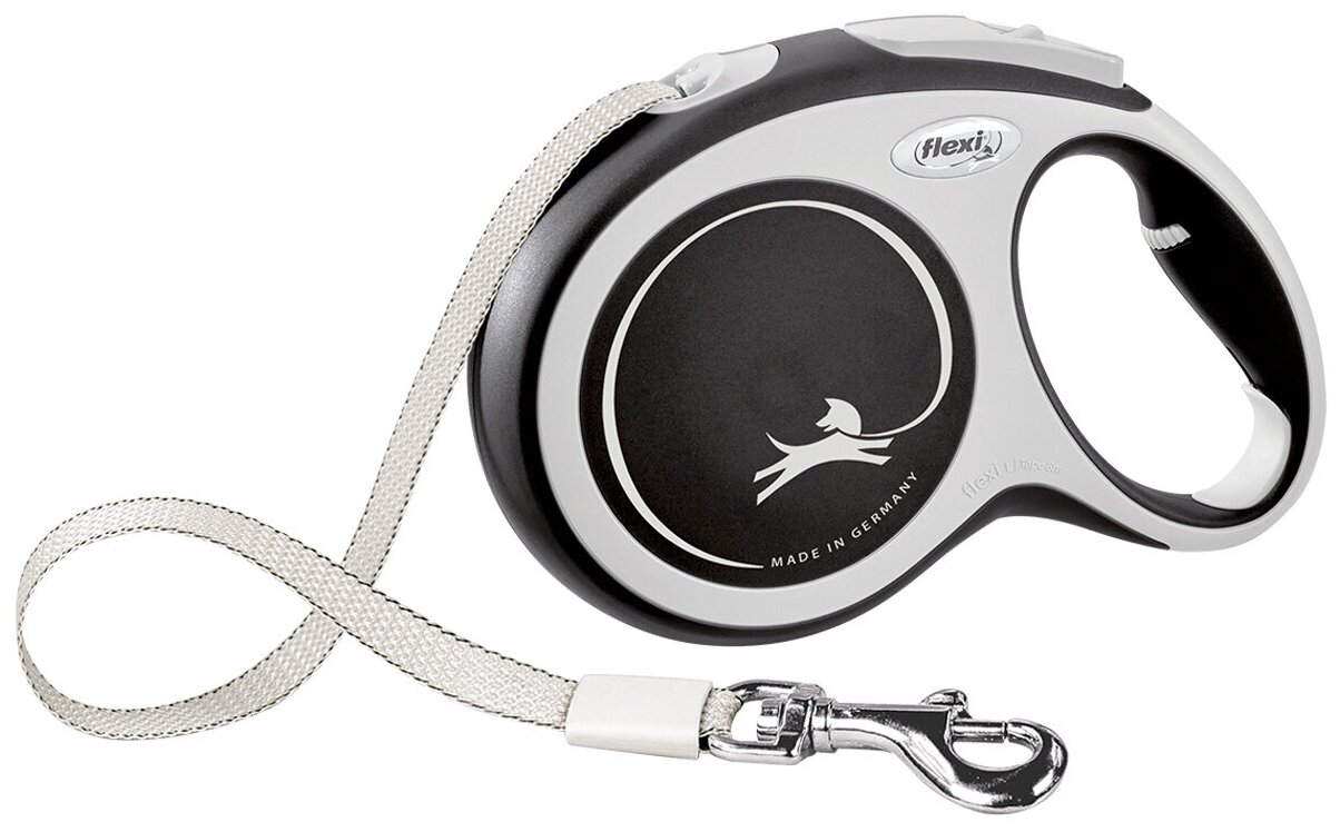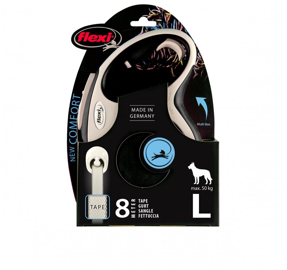 Поводок-рулетка Flexi New Comfort L 8 м 50 кг, синий.Надежный поводок-рулетка для ежедневной прогулки с собакой средних размеров, чей вес не превышает 50 кг. Рулетка является надежной в эксплуатации и долговечной. Отличительной особенностью является то, что ваша собака не ограничена в движении, но даже в случае рывка, она не почувствует дискомфорт. Вы можете быстро и плавно сократить расстояние между вами и собакой.В новой рулетке улучшена эргономика, цвета корпусов более стильные с силуэтом собаки на поводке.Серия New Comfort отличается стильным внешним видом и рядом удобств. Так например, при сматывании ременного поводка он не перекручивается и не застревает в механизме. При этом ремешок никогда не провисает.ЭргономикаПрорезиненные элементы корпуса препятствуют скольжению и способствуют тому, что в руках держится рулетка очень прочно. Этому также способствует особая форма ручки, подходящая анатомически для удобного захвата рукой. Встроенный тормозной механизм запатентован брендом Flexi и обеспечивает постоянную или кратковременную фиксацию длины поводка. Также очень плавно работает и возвратный механизм.НадежностьРулетка выполненная из безопасных крепких материалов и имеет высококачественную сборку. Это позволило получить износостойкий корпус. Хромированная застежка обеспечивает крепкое сцепление с ошейником. В целом, рулетка не выцветает и не деформируется при механическом воздействии или при длительном использовании, в том числе и на солнце.