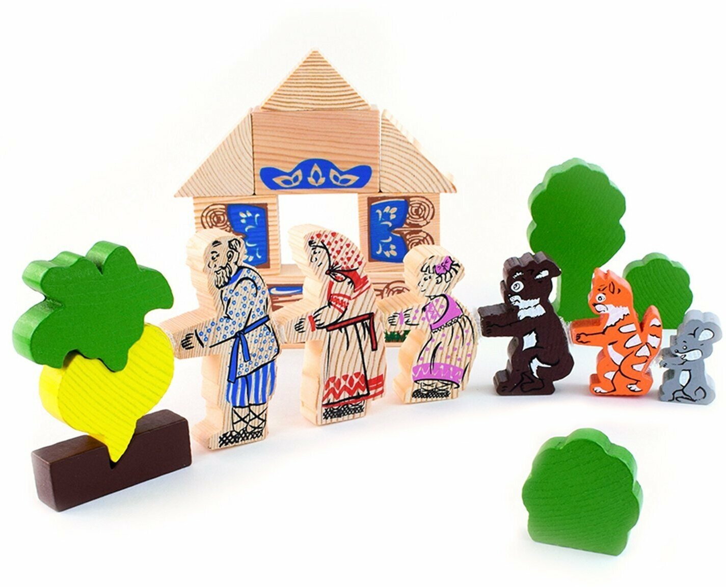 Конструктор понравился. Все фигурки еще и на липучках. Хорошо обработаны. Устойчивые. Все ярко, как на фото. Узнаваемые персонажи. В комплекте все персонажи сказки, 1 дерево, 2 куста, 3 треугольника, 2 квадрата, 2 прямоугольника, один из них большой. Можно строить разные домики. Приятно пахнет деревом (сосной). Репка их трех частей: мини пазл такой.
