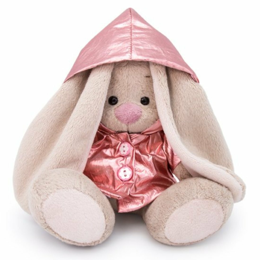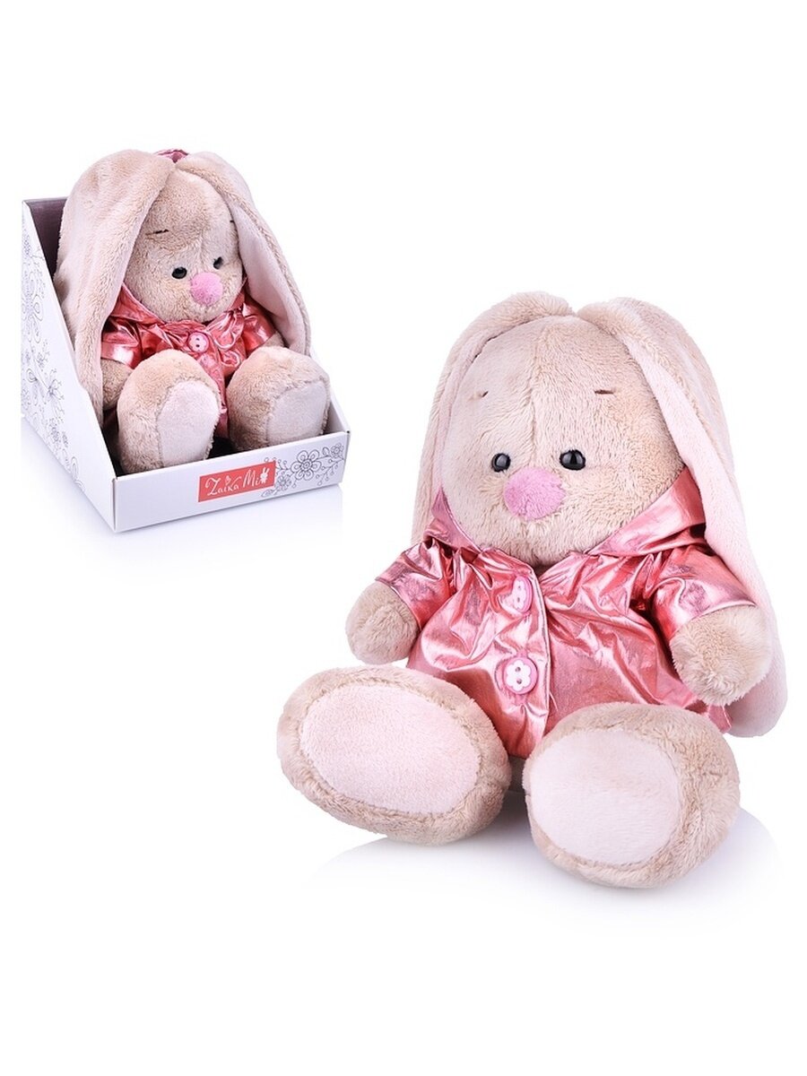 Зайка в модном плащике из ткани металлик цвета розового золота. Плащ сшит на подкладе из розового ситца в белый горошек. Зайка Ми - увлекательная история о моде, творчестве и красоте двух очаровательных Заек Мики и Мии, невероятно популярных и нежно любимых героев, с особым характером и неповторимым стилем. Вокруг Зайки Ми создан целый мир с дизайнерскими коллекциями и изящными аксессуарами, сезонными новинками и нарядами на любой случай.