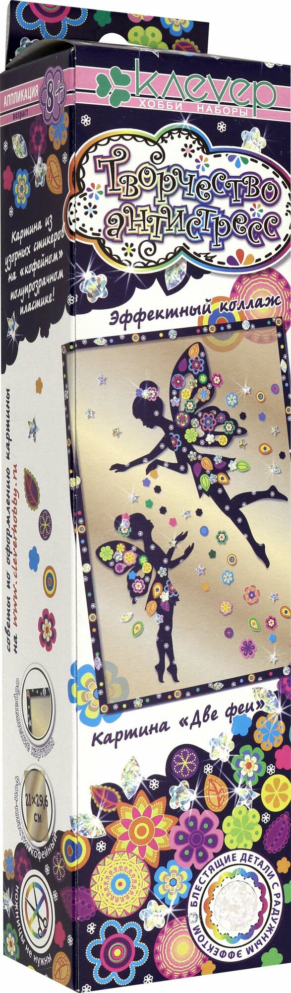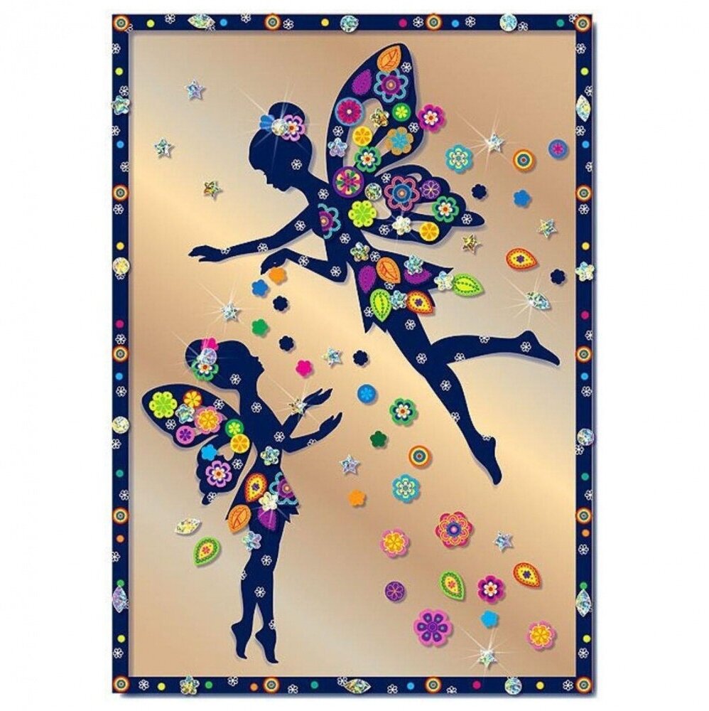 Картина-коллаж из стильных стикеров на затемнённом полупрозрачном пластике "Две феи" понравится ребёнку старше 8 лет: он легко наклеит на пластик части рамки, силуэты фей, а затем украсит изображение узорными и блестящими стикерами, как будто феи своим волшебством создают из воздуха красочные цветы. Особенно эффектно картина смотрится на фоне узора обоев, который слегка просвечивает сквозь полупрозрачный пластик кофейного оттенка. А в рамке из багета картина-коллаж превратится в настоящий шедевр и станет ярким акцентом в любом интерьере!