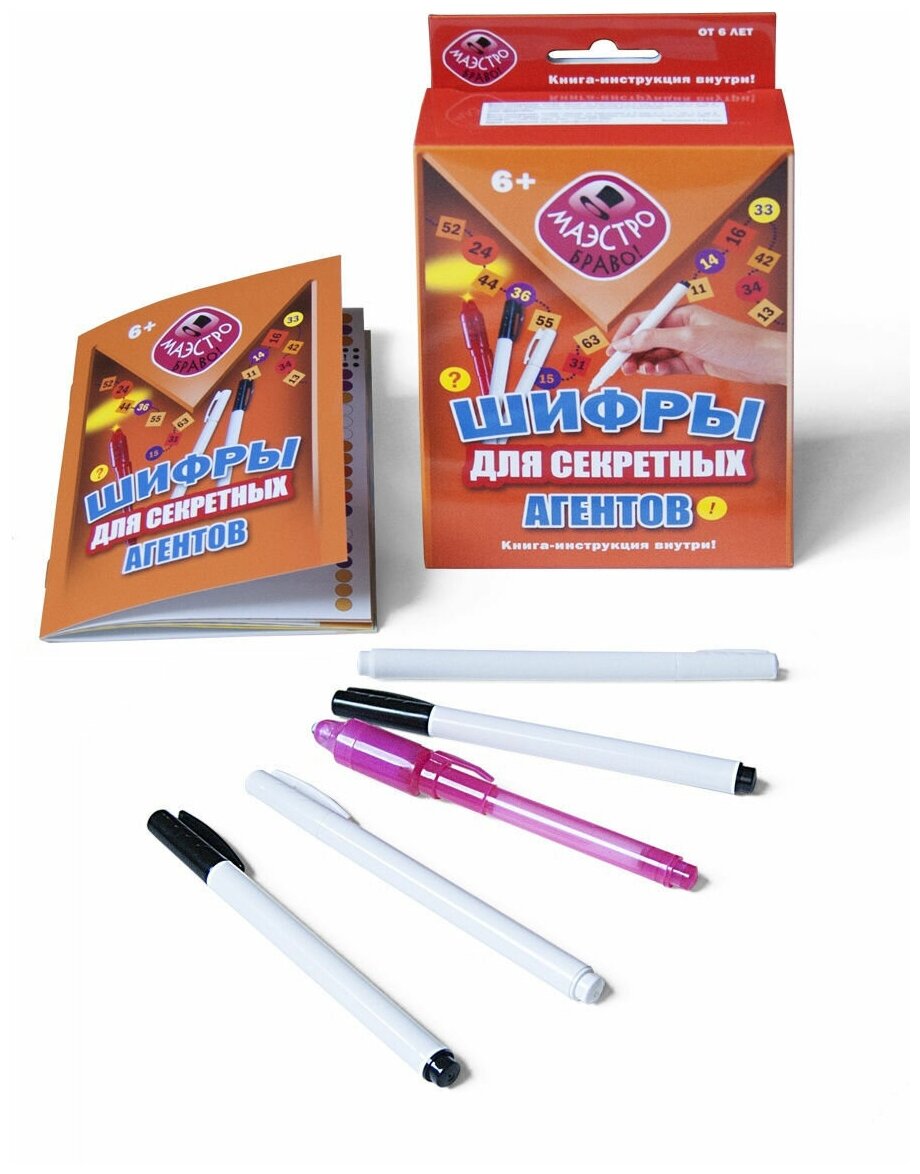 | Комплектация | секретные маркеры с бесцветными чернилами; проявляющик маркера; маркер с ультрафиолетовым фонариком; книга-инструкция |