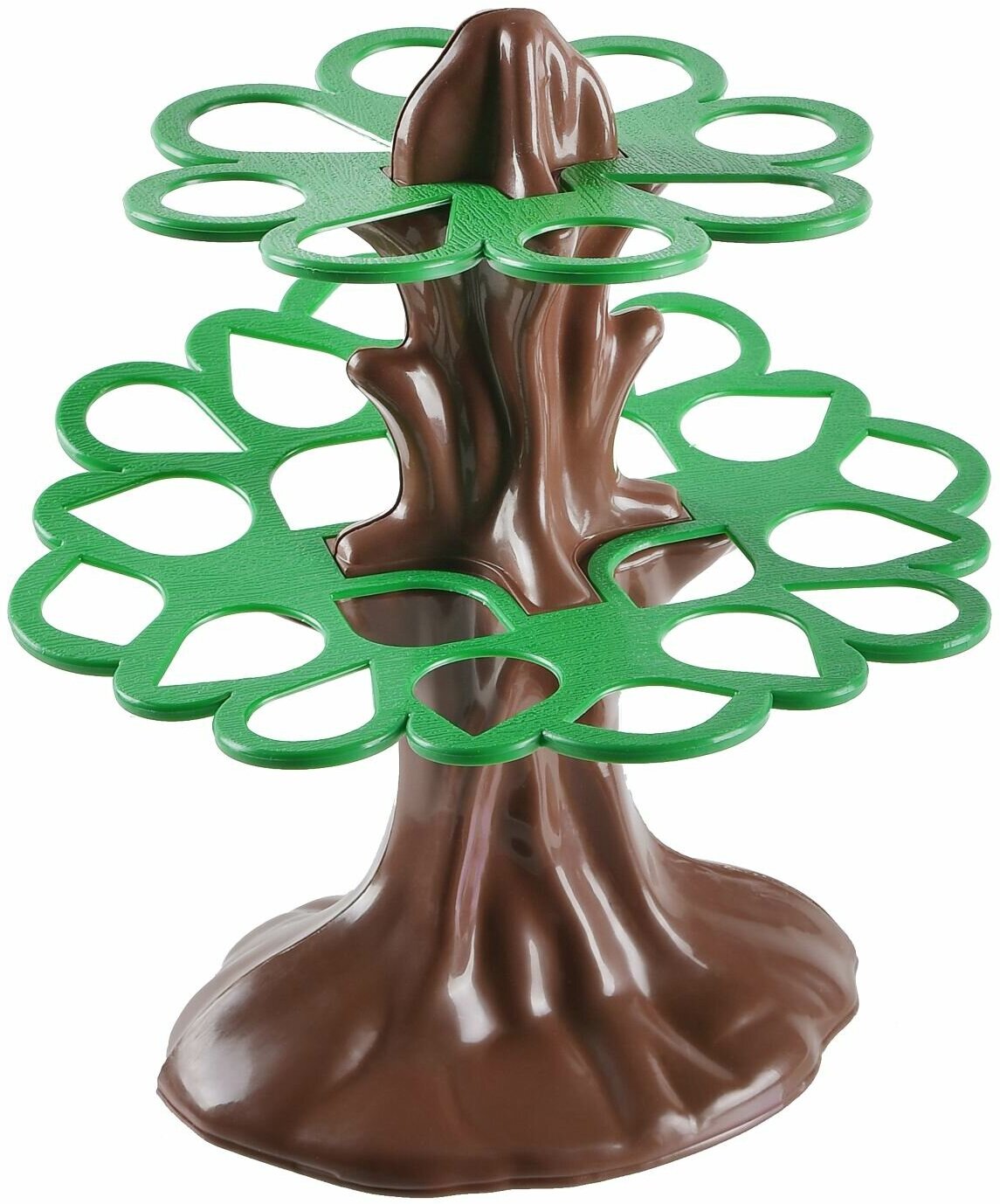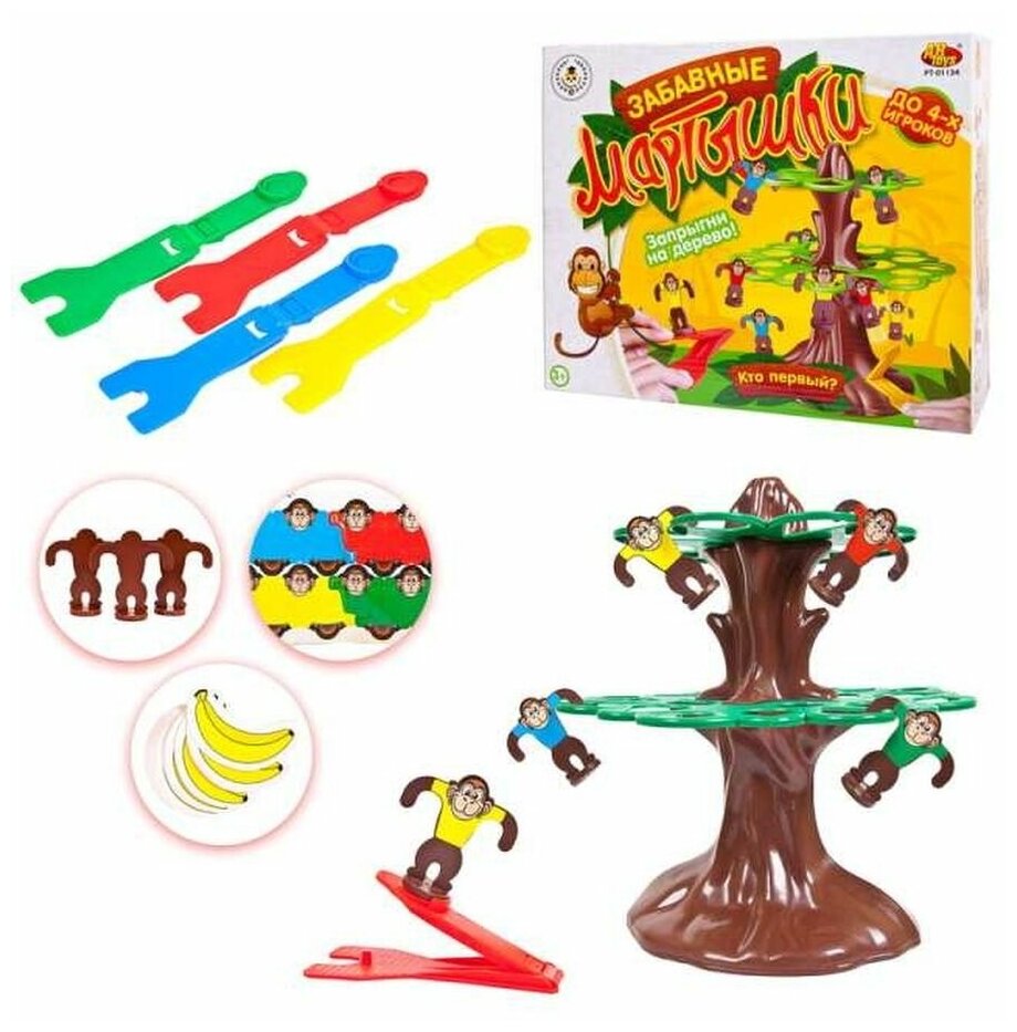 Комплектация: дерево - 2 части, обезьяны - 16 шт (4 по 4 цвета каждая), бананы - 16 шт, крона дерева - 2 шт, пусковая установка - 4 шт (4 цвета), наклейки.