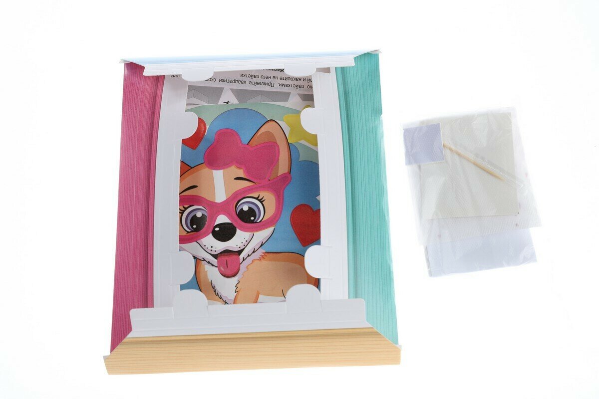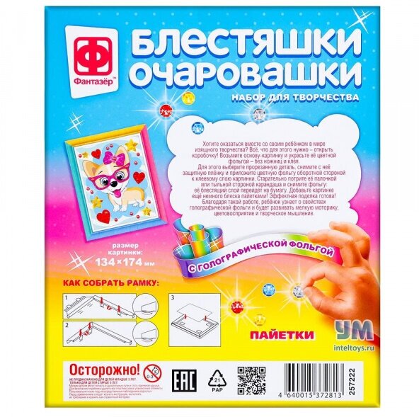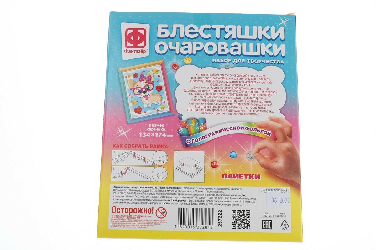 В наборе: фольга, пайетки, цветная основа с клеевым слоем, объёмная рамка, деревянный стик, клеящие элементы, инструкция.