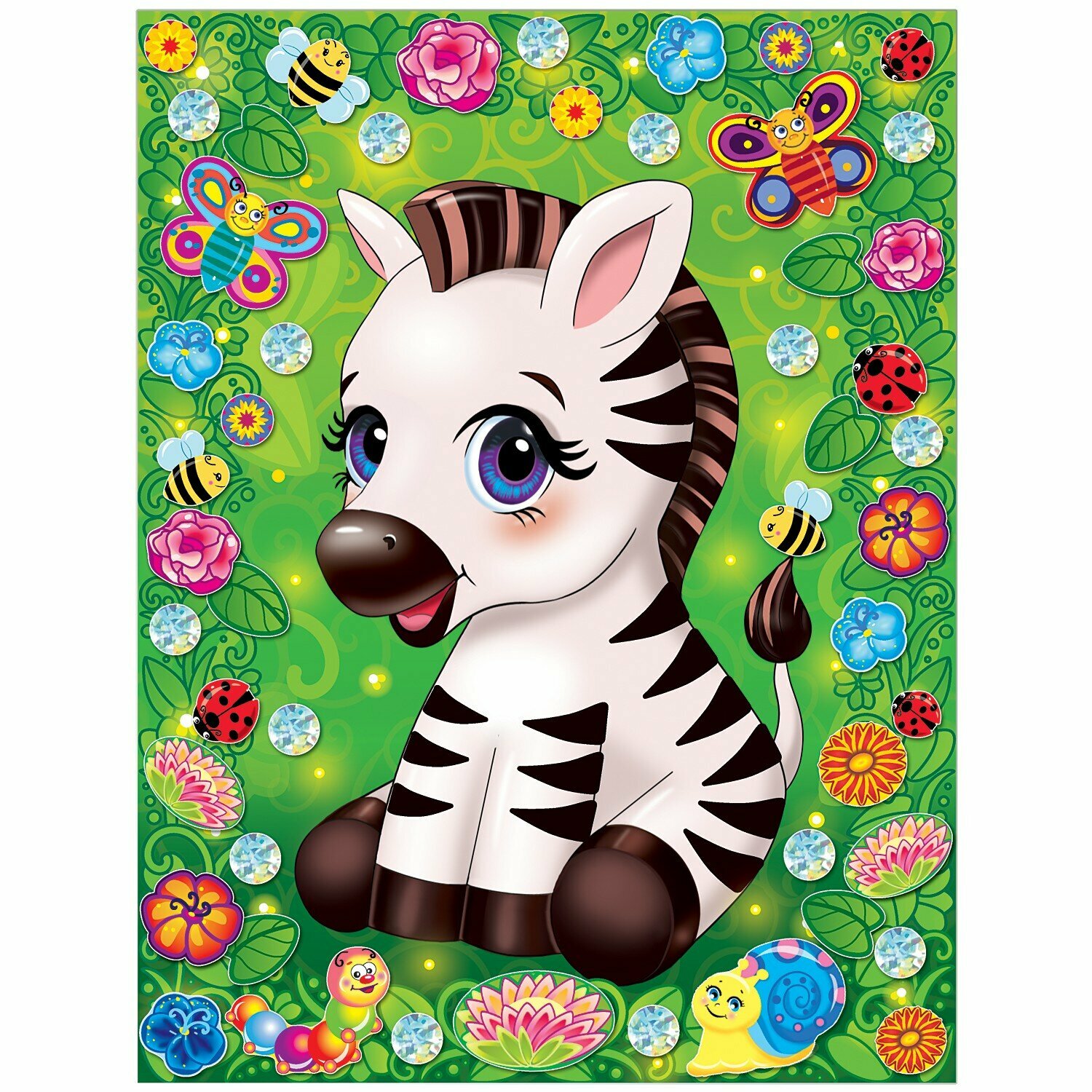 Детям от 3-х лет будет несложно создать картину с милым Зебриком: нужно наклеить стикеры-полоски на изображение персонажа на фоне, затем заполнить пространство вокруг него яркими стикерами-цветами, листьями, насекомыми, украсить голографическими сверкающими элементами, - и замечательная картина в солнечных летних красках готова!