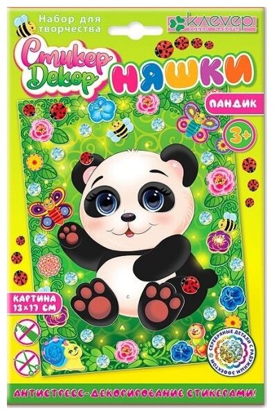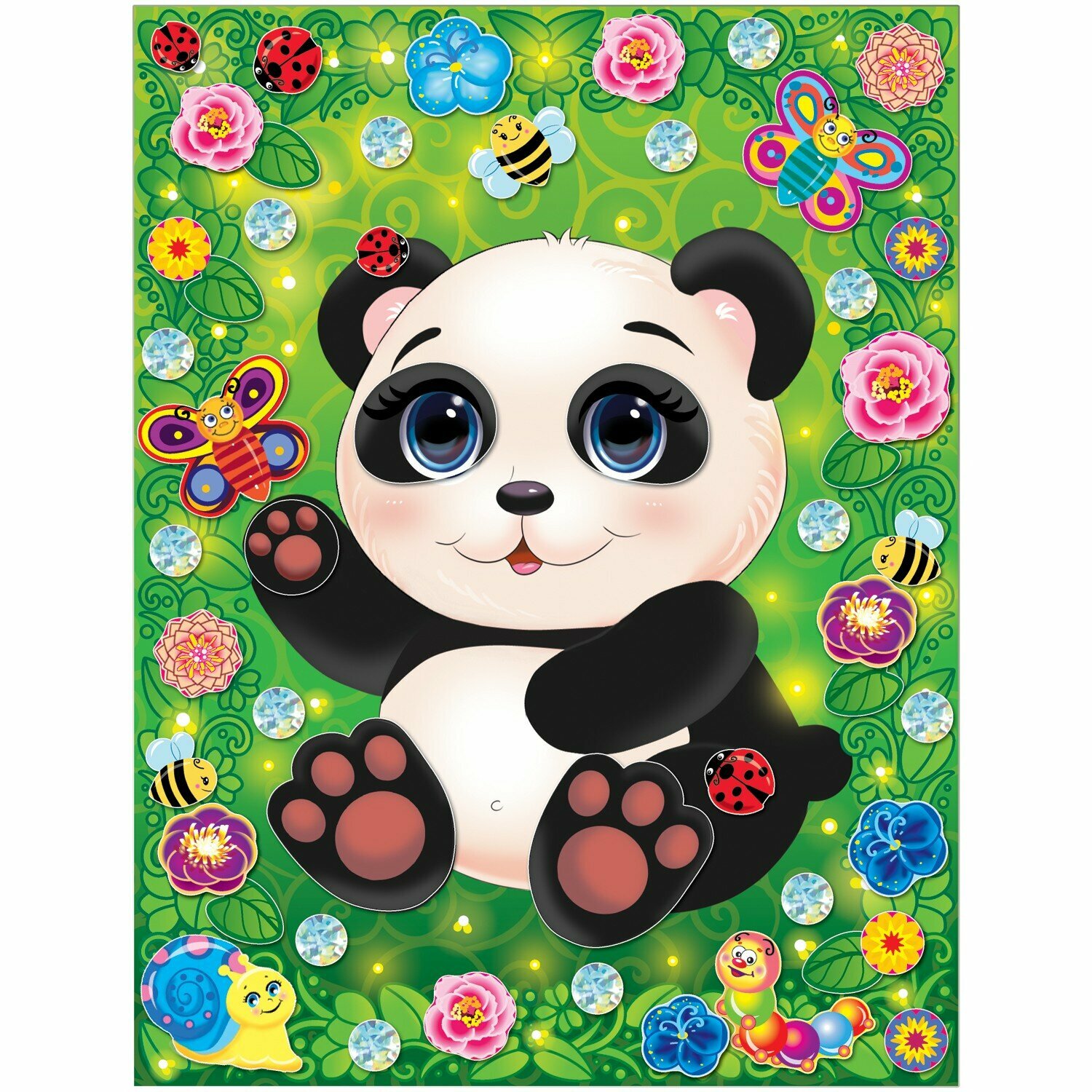 Детям от 3-х лет будет несложно создать картину с забавным Пандиком: нужно наклеить стикеры-пятнышки и лапки на изображение персонажа на фоне, затем заполнить пространство вокруг него яркими стикерами-цветами, листьями, насекомыми, украсить голографическими сверкающими элементами, - и замечательная картина в солнечных летних красках готова!