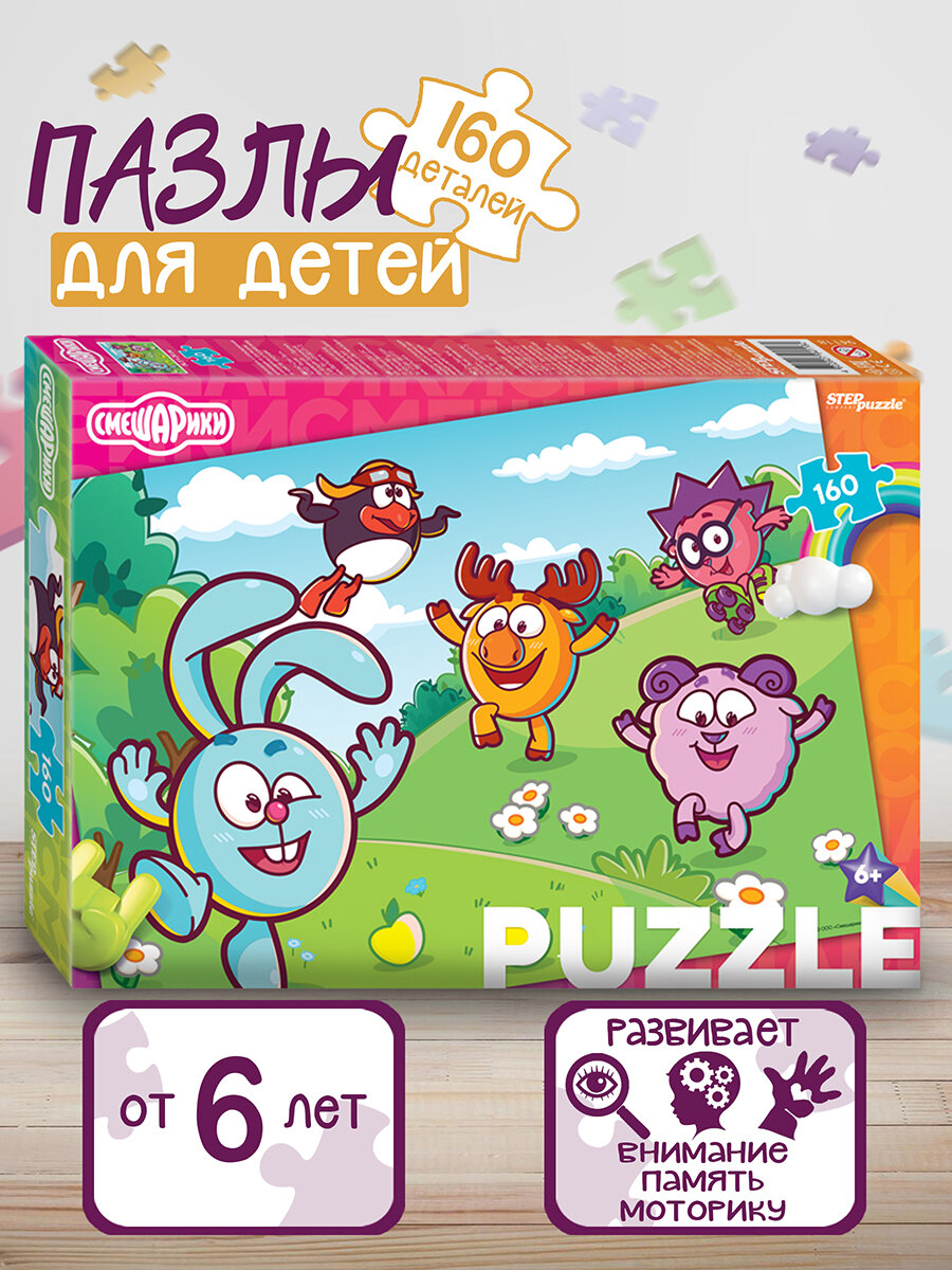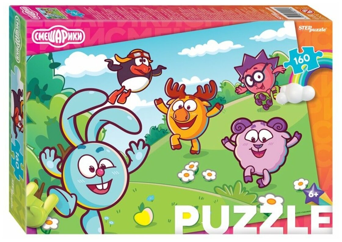 Пазл "Смешарики" состоит из 160 деталей. На его картинке нарисованы пятеро главных геров, они веселятся и дурачатся на лесной полянке.